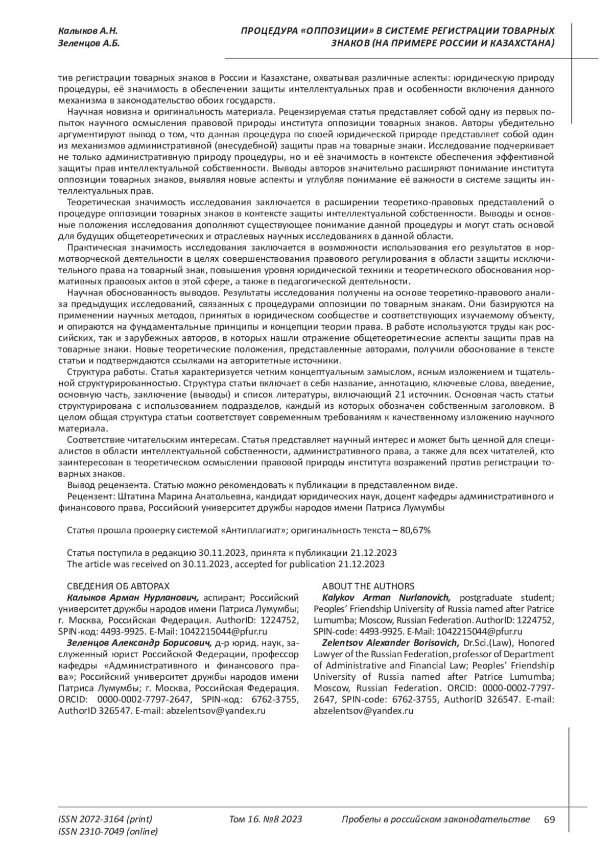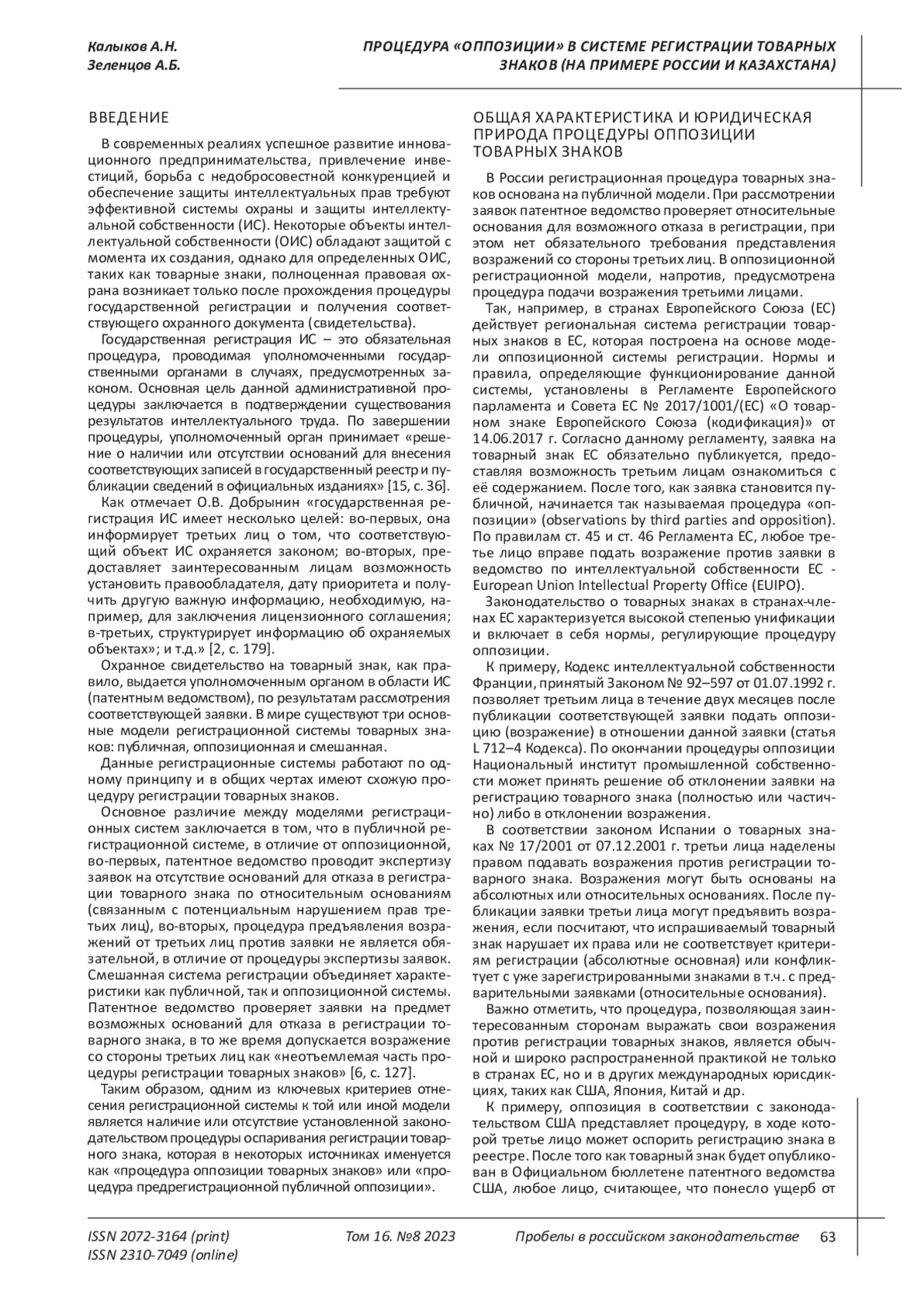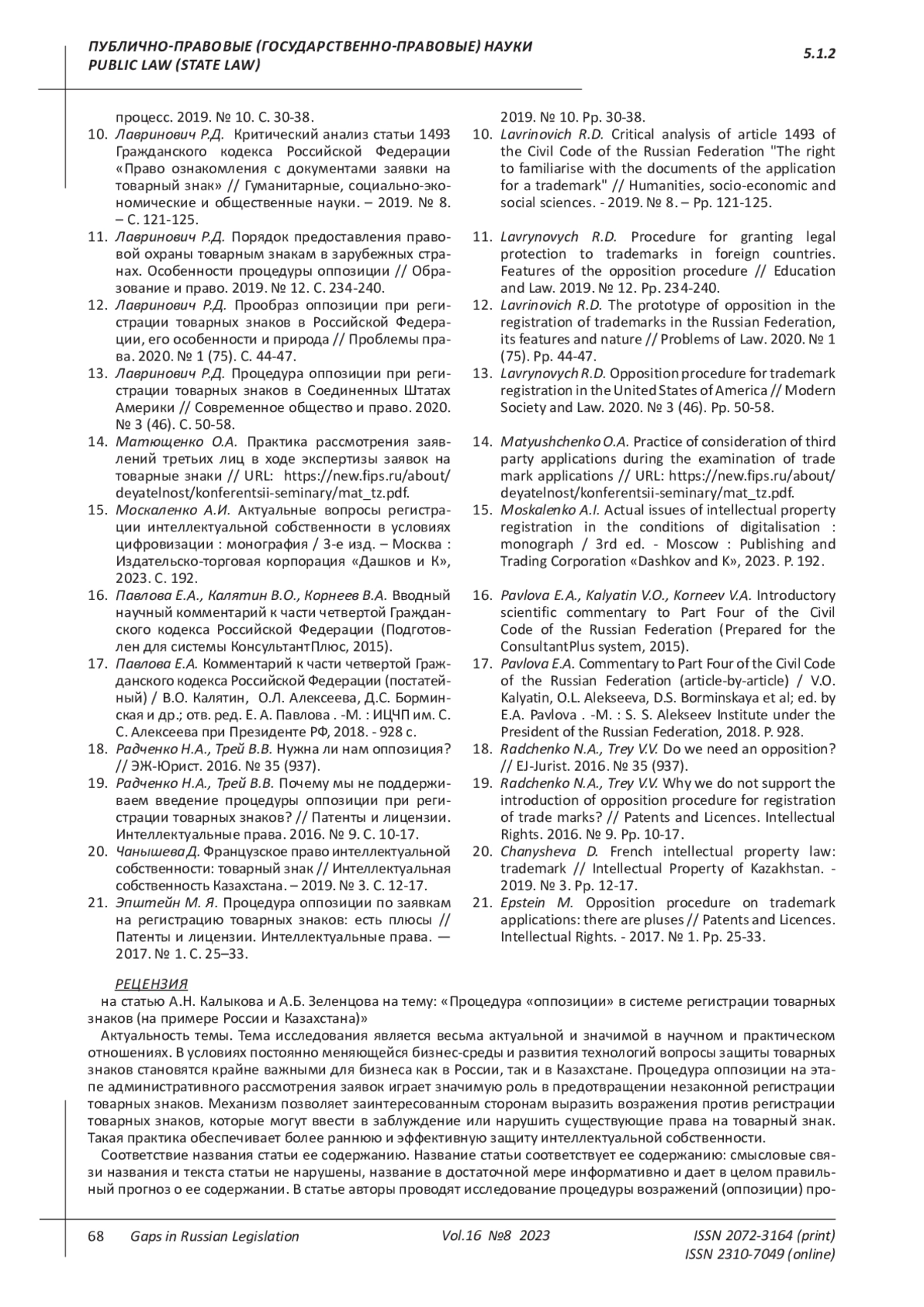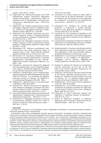 12. 	Лавринович Р.Д. Прообраз оппозиции при регистрации товарных знаков в Российской Федерации, его особенности и природа // Проблемы права. 2020. № 1 (75). С. 44-47. EDN: KVQRXJ