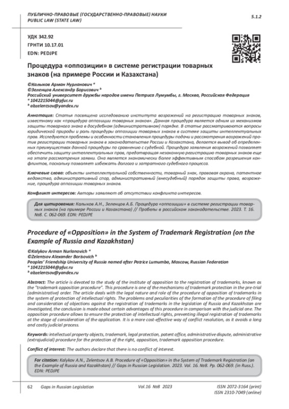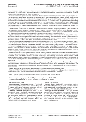 Статья посвящена исследованию института возражений на регистрацию товарных знаков, известному как «процедура оппозиции товарных знаков». Данная процедура является одним из механизмов защиты товарного знака в досудебном (административном) порядке. В статье рассматриваются вопросы юридической природы и роль процедуры оппозиции товарных знаков в системе защиты интеллектуальных прав. Исследуются проблемы и особенности становления процедуры подачи и рассмотрения возражений против регистрации товарных знаков в законодательстве России и Казахстана, делается вывод об определенных преимуществах данной процедуры по сравнению с судебной. Процедура заявления возражений позволяет обеспечить защиту интеллектуальных прав, предотвращая незаконную регистрацию товарных знаков еще на этапе рассмотрения заявки. Она является экономически более эффективным способом разрешения конфликтов, поскольку позволяет избежать долгого и затратного судебного процесса.