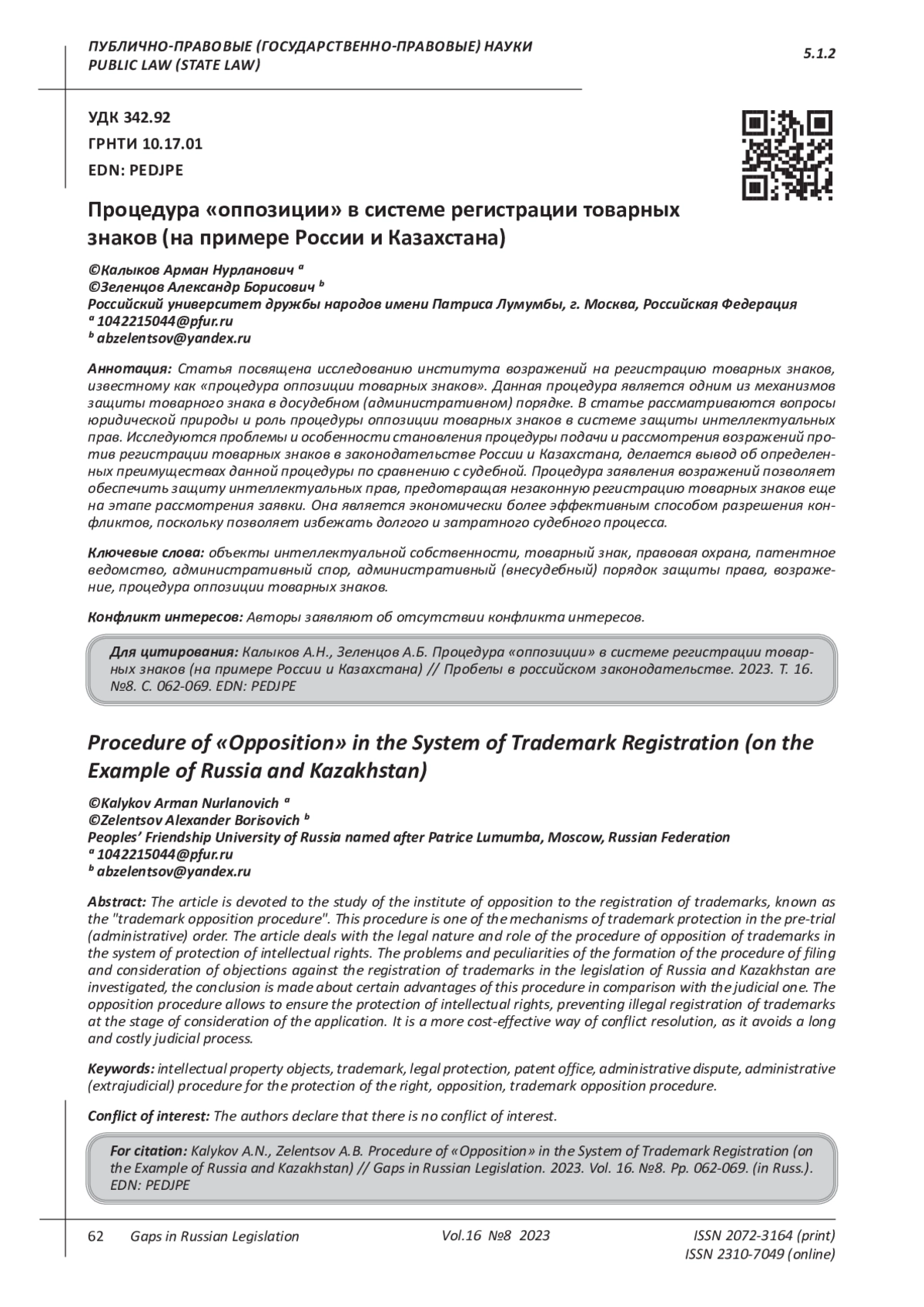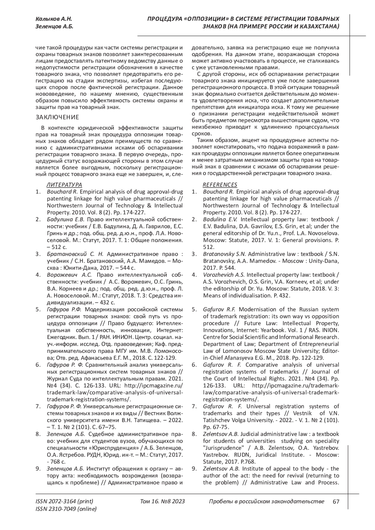 5. 	Гафуров Р.Ф. Модернизация российской системы регистрации товарных знаков: свой путь vs процедура оппозиции // Право будущего: Интеллектуальная собственность, инновации, Интернет: Ежегодник. Вып. 1 / РАН. ИНИОН. Центр. социал. науч.-информ. исслед. Отд. правоведения; Каф. предпринимательского права МГУ им. М.В. Ломоносова; Отв. ред. Афанасьева Е.Г. М., 2018. С. 122-129. EDN: VTSKYP