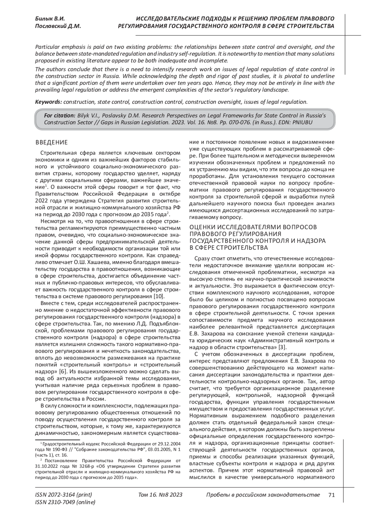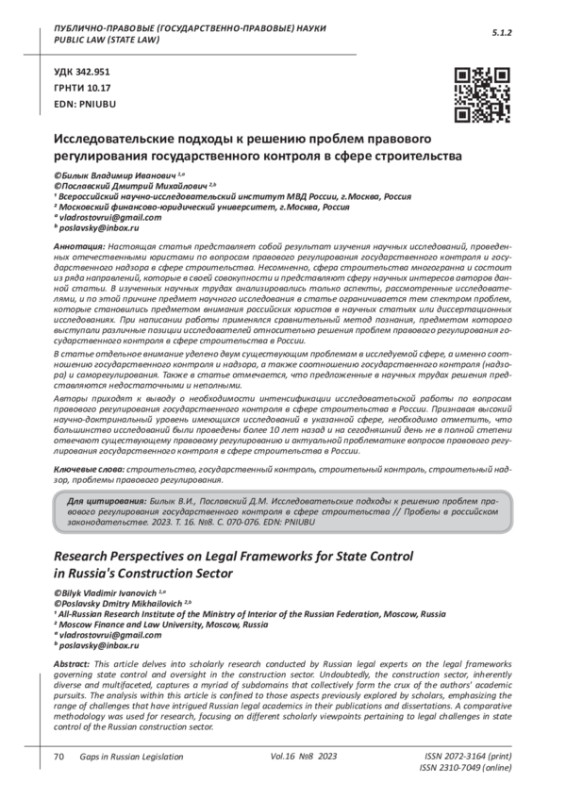 Настоящая статья представляет собой результат изучения научных исследований, проведенных отечественными юристами по вопросам правового регулирования государственного контроля и государственного надзора в сфере строительства. Несомненно, сфера строительства многогранна и состоит из ряда направлений, которые в своей совокупности и представляют сферу научных интересов авторов данной статьи. В изученных научных трудах анализировались только аспекты, рассмотренные исследователями, и по этой причине предмет научного исследования в статье ограничивается тем спектром проблем, которые становились предметом внимания российских юристов в научных статьях или диссертационных исследованиях. При написании работы применялся сравнительный метод познания, предметом которого выступали различные позиции исследователей относительно решения проблем правового регулирования государственного контроля в сфере строительства в России. В статье отдельное внимание уделено двум существующим проблемам в исследуемой сфере, а именно соотношению государственного контроля и надзора, а также соотношению государственного контроля (надзора) и саморегулирования. Также в статье отмечается, что предложенные в научных трудах решения представляются недостаточными и неполными. Авторы приходят к выводу о необходимости интенсификации исследовательской работы по вопросам правового регулирования государственного контроля в сфере строительства в России. Признавая высокий научно-доктринальный уровень имеющихся исследований в указанной сфере, необходимо отметить, что большинство исследований были проведены более 10 лет назад и на сегодняшний день не в полной степени отвечают существующему правовому регулированию и актуальной проблематике вопросов правового регулирования государственного контроля в сфере строительства в России.