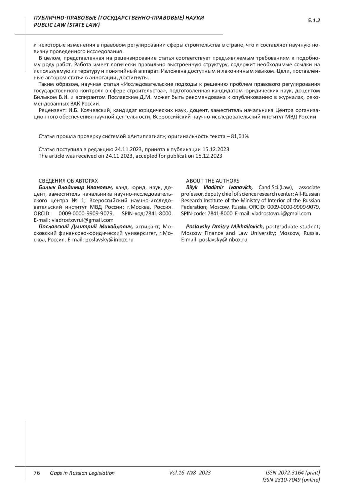 6. 	Подъяблонская Л.Д. “Теоретические основы государственного контроля и надзора в сфере строительной деятельности” // Вестник науки и образования. 2022. №9 (129).