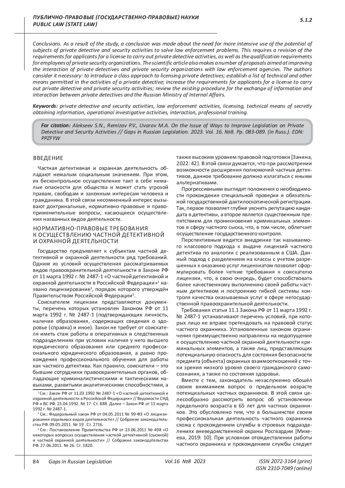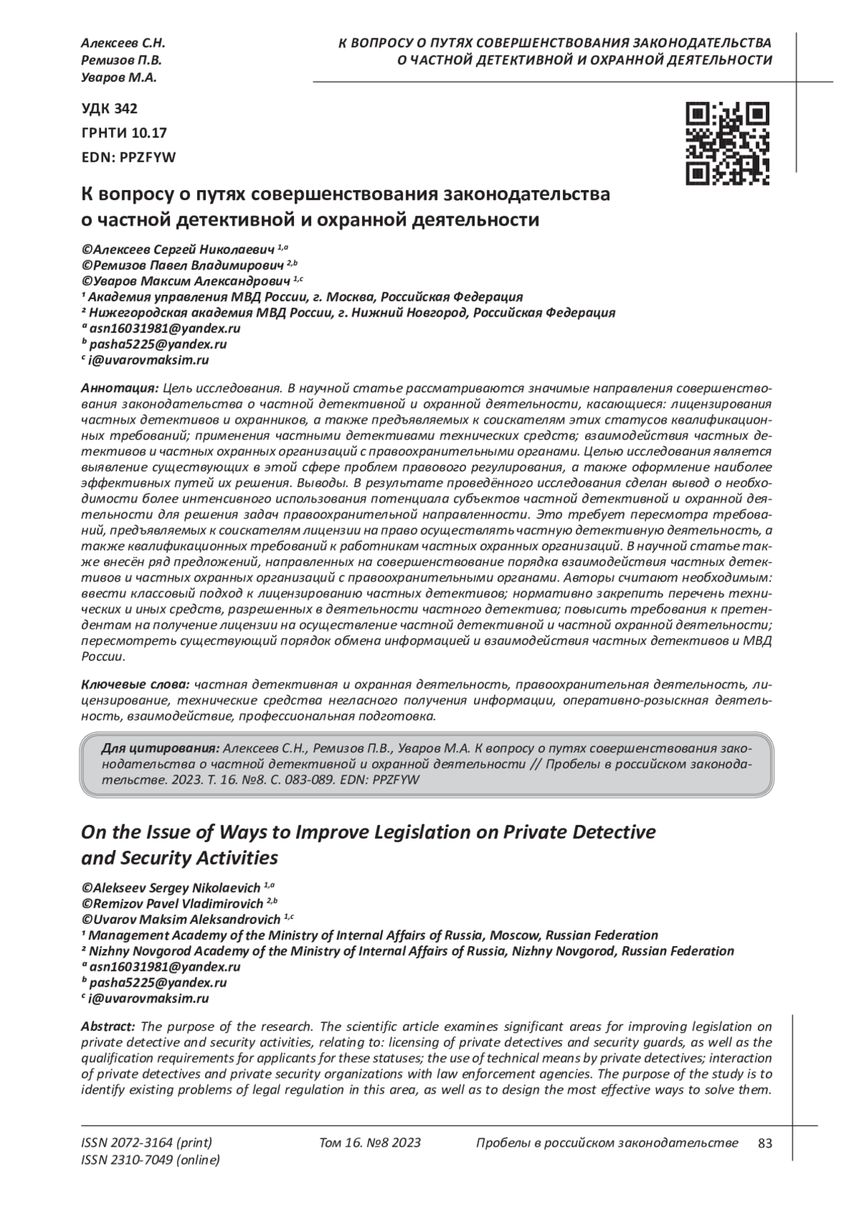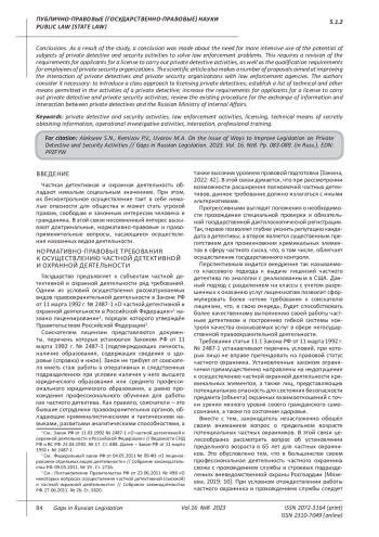 Цель исследования. В научной статье рассматриваются значимые направления совершенствования законодательства о частной детективной и охранной деятельности, касающиеся: лицензирования частных детективов и охранников, а также предъявляемых к соискателям этих статусов квалификационных требований; применения частными детективами технических средств; взаимодействия частных детективов и частных охранных организаций с правоохранительными органами. Целью исследования является выявление существующих в этой сфере проблем правового регулирования, а также оформление наиболее эффективных путей их решения. Выводы. В результате проведённого исследования сделан вывод о необходимости более интенсивного использования потенциала субъектов частной детективной и охранной деятельности для решения задач правоохранительной направленности. Это требует пересмотра требований, предъявляемых к соискателям лицензии на право осуществлять частную детективную деятельность, а также квалификационных требований к работникам частных охранных организаций. В научной статье также внесён ряд предложений, направленных на совершенствование порядка взаимодействия частных детективов и частных охранных организаций с правоохранительными органами. Авторы считают необходимым: ввести классовый подход к лицензированию частных детективов; нормативно закрепить перечень технических и иных средств, разрешенных в деятельности частного детектива; повысить требования к претендентам на получение лицензии на осуществление частной детективной и частной охранной деятельности; пересмотреть существующий порядок обмена информацией и взаимодействия частных детективов и МВД России.