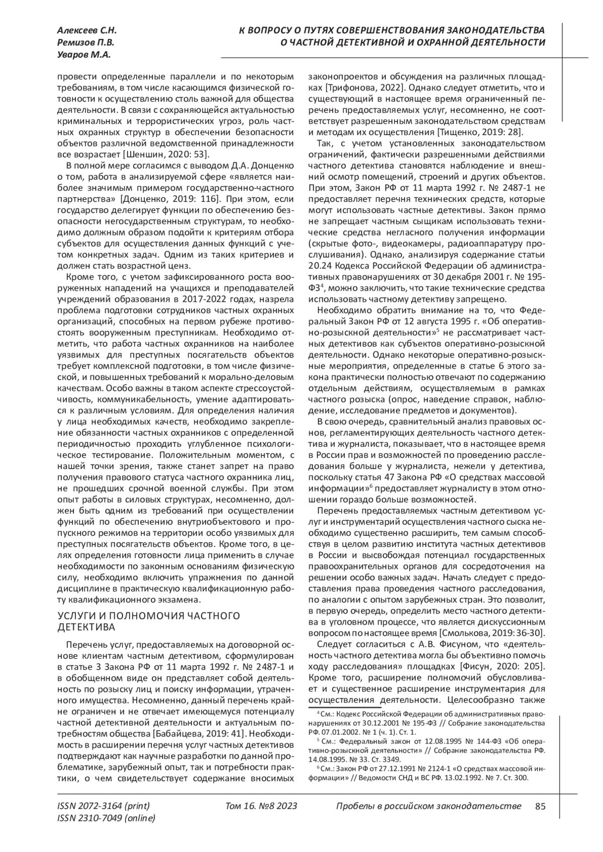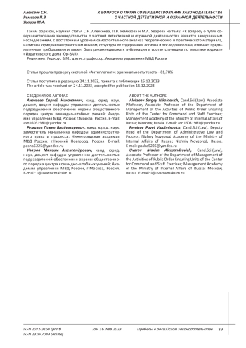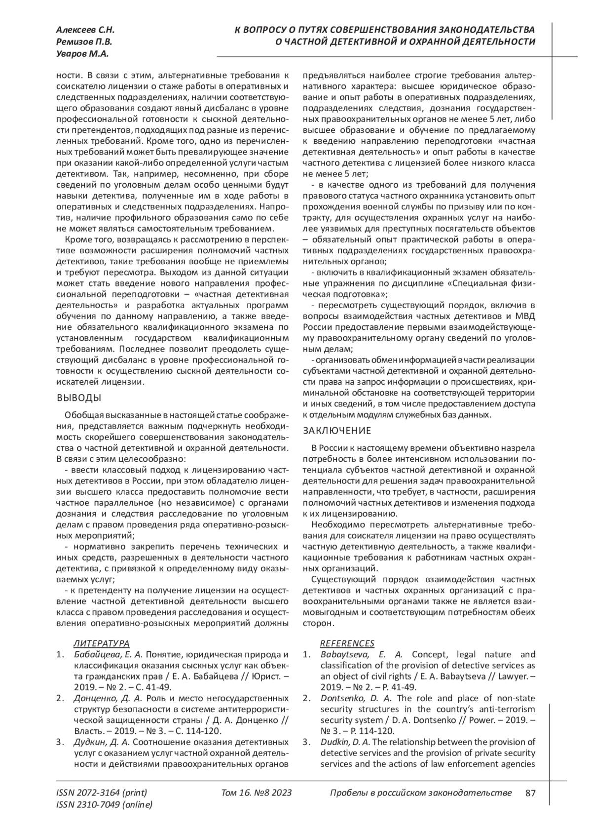 Dudkin, D. A. The relationship between the provision of detective services and the provision of private security services and the actions of law enforcement agencies in the field of detective and security / D. A. Dudkin // Russian investigator. - 2022. - № 9. - P. 63-67. EDN: WVROTE