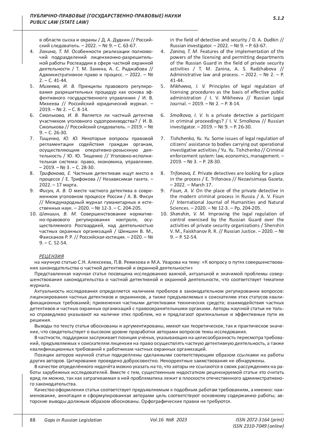 4. 	Занина, Т. М. Особенности реализации полномочий подразделений лицензионно-разрешительной работы Росгвардии в сфере частной охранной деятельности / Т. М. Занина, А. С. Раджабова // Административное право и процесс. - 2022. - № 2. - С. 41-44. EDN: JXHNMU