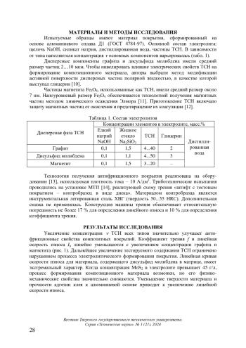 Исследованы триботехнические характеристики инновационного материала, представляющего собой композиционное покрытие с матрицей из оксида алюминия и наполнителями из нанодисперсного магнетита и микродисперсных дисульфида молибдена, графита. Установлено, что минимальные значения коэффициента трения и интенсивности изнашивания при сохранении высоких прочностных свойств материалов достигаются при концентрации дисперсных частиц в электролите: для магнетита – не более 20 г/л; графита – не более 40 г/л; дисульфида молибдена – 45 г/л. Подчеркнуто, что испытания показали стабильность коэффициента трения исследуемых покрытий в течение 90 часов. Изучено влияние контактного давления на интенсивность линейного износа. Предложен критерий перехода от упругого контакта к пластическому. На основании этого получено расчетное соотношение для оценки перехода от стабильной работы трибосопряжения к его катастрофическому изнашиванию