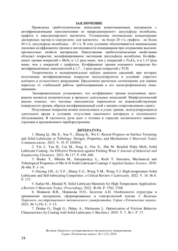 1. 	Huang Q., Shi X., Xue Y., Zhang K., Wu C. Recent Progress on Surface Texturing and Solid Lubricants in Tribology: Designs, Properties, and Mechanisms // Materials Today Communications. 2023. V. 35. P. 105854.  EDN: IWOXKI