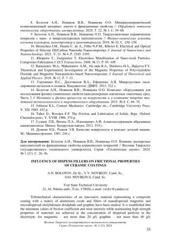 9. 	Болотов А.Н., Новиков В.В., Новикова О.О. Твердосмазочные керамические покрытия с нано- и микродисперсным наполнителем // Физико-химические аспекты изучения кластеров, наноструктур и наноматериалов. 2018. № 10. С. 150-158.  EDN: YUNWXB