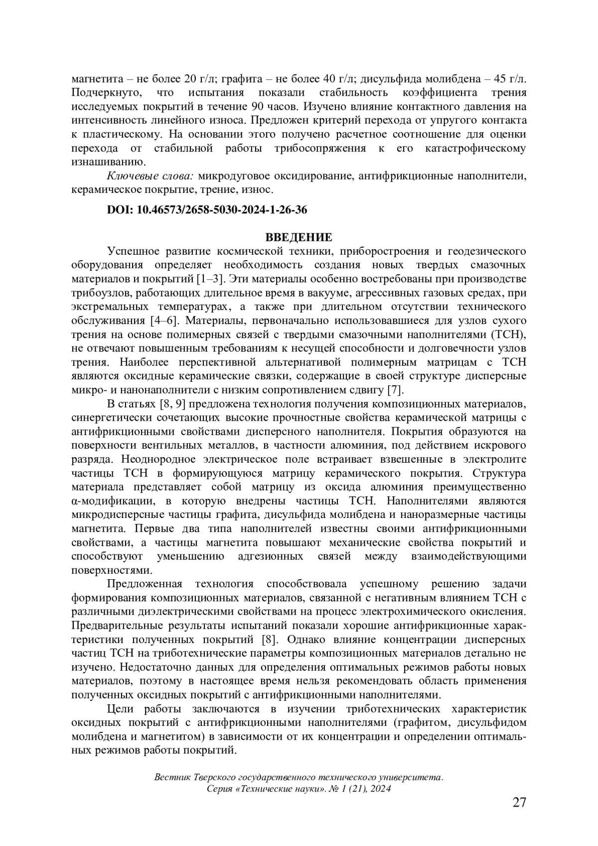 Успешное развитие космической техники, приборостроения и геодезического оборудования определяет необходимость создания новых твердых смазочных материалов и покрытий [1–3]. Эти материалы особенно востребованы при производстве трибоузлов, работающих длительное время в вакууме, агрессивных газовых средах, при экстремальных температурах, а также при длительном отсутствии технического обслуживания [4–6]. Материалы, первоначально использовавшиеся для узлов сухого трения на основе полимерных связей с твердыми смазочными наполнителями (ТСН), не отвечают повышенным требованиям к несущей способности и долговечности узлов трения. Наиболее перспективной альтернативой полимерным матрицам с ТСН являются оксидные керамические связки, содержащие в своей структуре дисперсные микро- и нанонаполнители с низким сопротивлением сдвигу