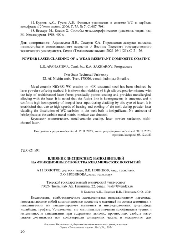 8. 	Болотов А.Н., Новиков В.В., Новикова О.О. Минералокерамический композиционный материал: синтез и фрикционные свойства // Обработка металлов (технология, оборудование, инструменты). 2020. Т. 22. № 3. С. 59-68.  EDN: NRXUIJ