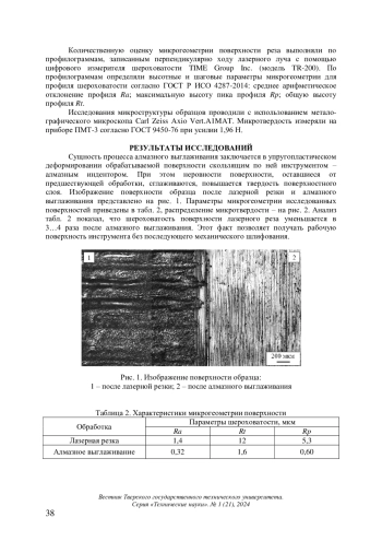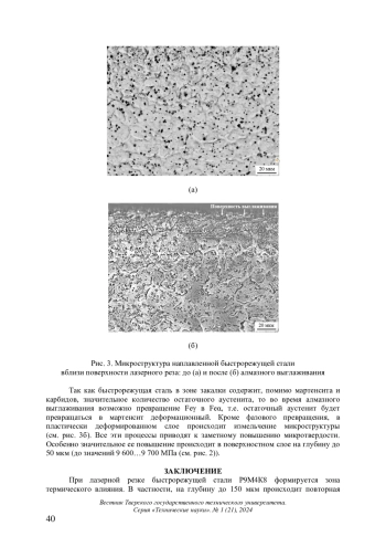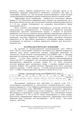 Представлены результаты исследований микроструктуры, микротвердости, микрогеометрии поверхности лазерного реза наплавленной быстрорежущей стали марки Р9М4К8 после алмазного выглаживания. Показано, что шероховатость поверхности лазерного реза уменьшается в 3…4 раза, что позволяет получать рабочую поверхность без последующего механического шлифования. Отмечено, что алмазное выглаживание приводит к измельчению микроструктуры, повышению микротвердости стали до 9 700 ± 130 МПа.