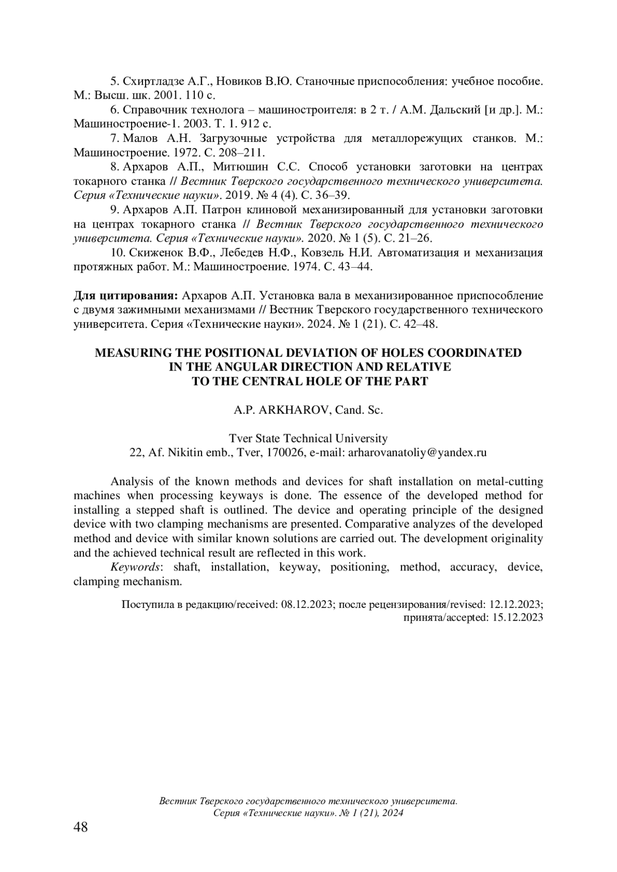 8. Архаров А.П., Митюшин С.С. Способ установки заготовки на центрах токарного станка // Вестник Тверского государственного технического университета. Серия “Технические науки”. 2019. № 4 (4). С. 36-39. EDN: BAYRVZ