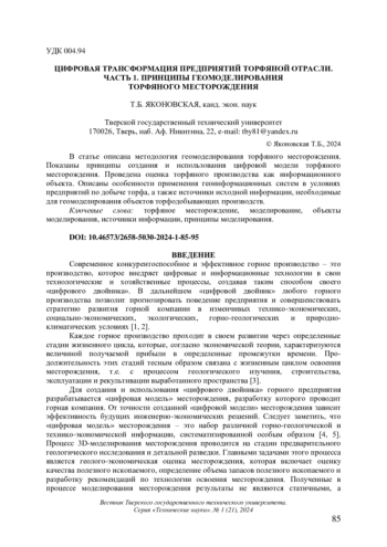 3. Яконовская Т.Б. Проблемы информатизации анализа геологических данных предприятий по добыче торфа // Интеллектуально-информационные технологии и интеллектуальный бизнес: материалы одиннадцатой заочной международной научно-технической конференции. Вологда: ВоГУ. 2020. С. 89-93. EDN: BDSLHU