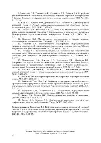 16. Шек В.М., Литвинов А.Г., Вознесенский Ю.С. Визуализация дискретных моделей сплошной среды // Горный информационно-аналитический бюллетень. 2009. № S2. С. 421-431. EDN: KZVRXN