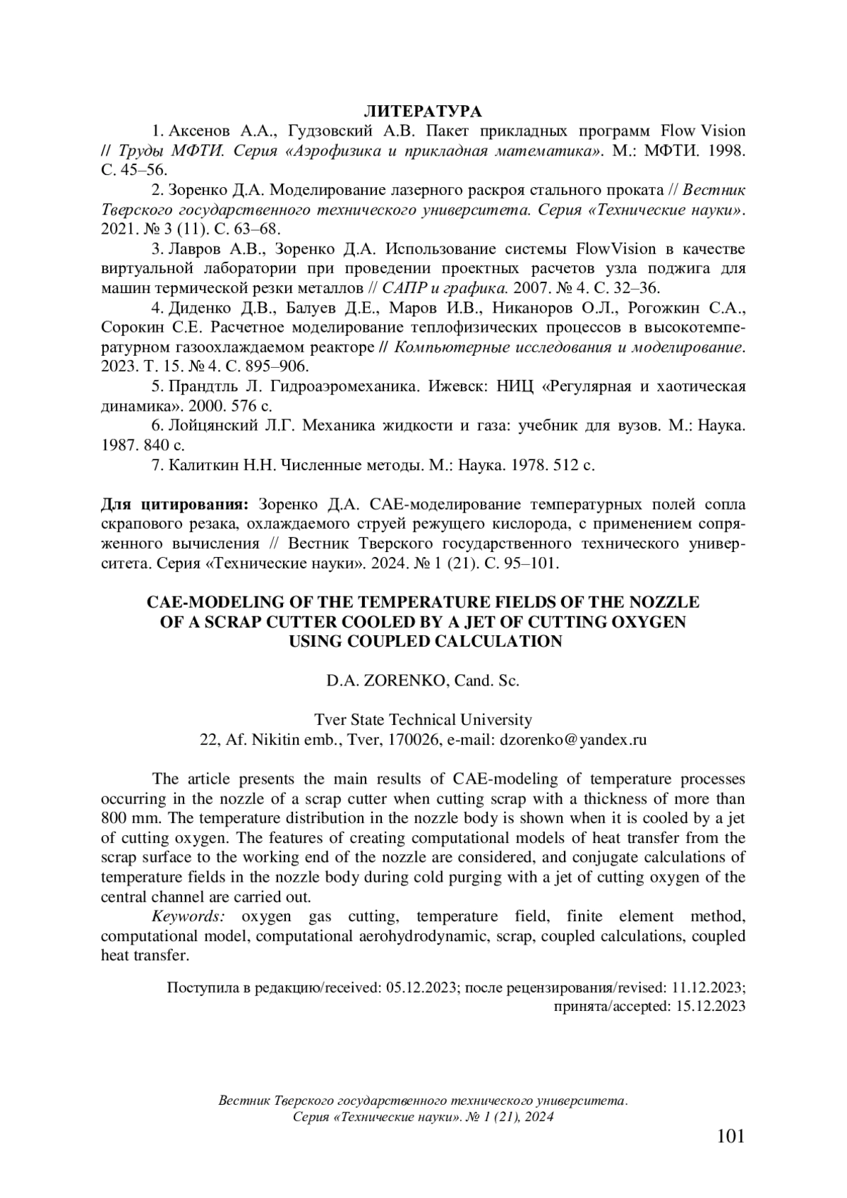 2. 	Зоренко Д.А. Моделирование лазерного раскроя стального проката // Вестник Тверского государственного технического университета. Серия “Технические науки”. 2021. № 3 (11). С. 63-68.  EDN: UEWMGN