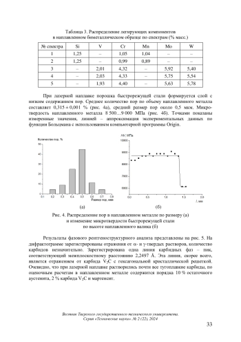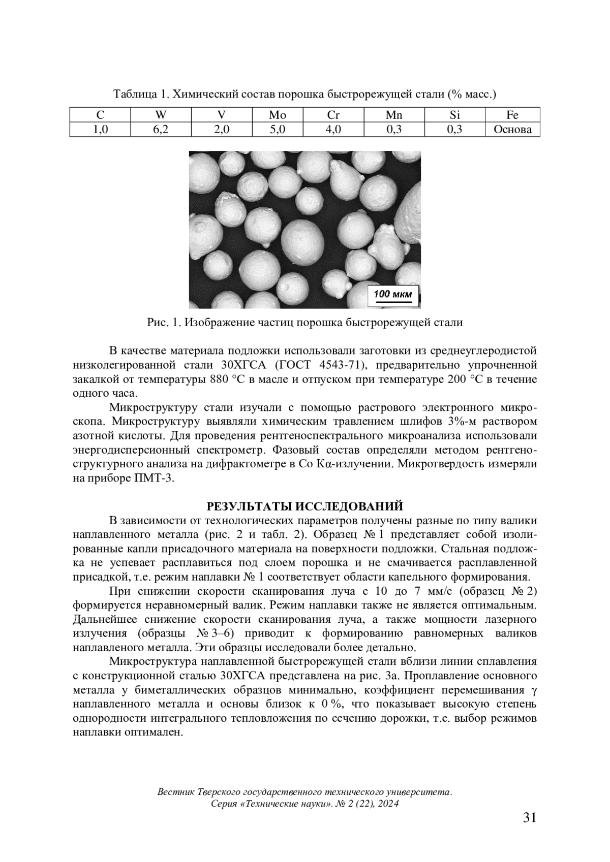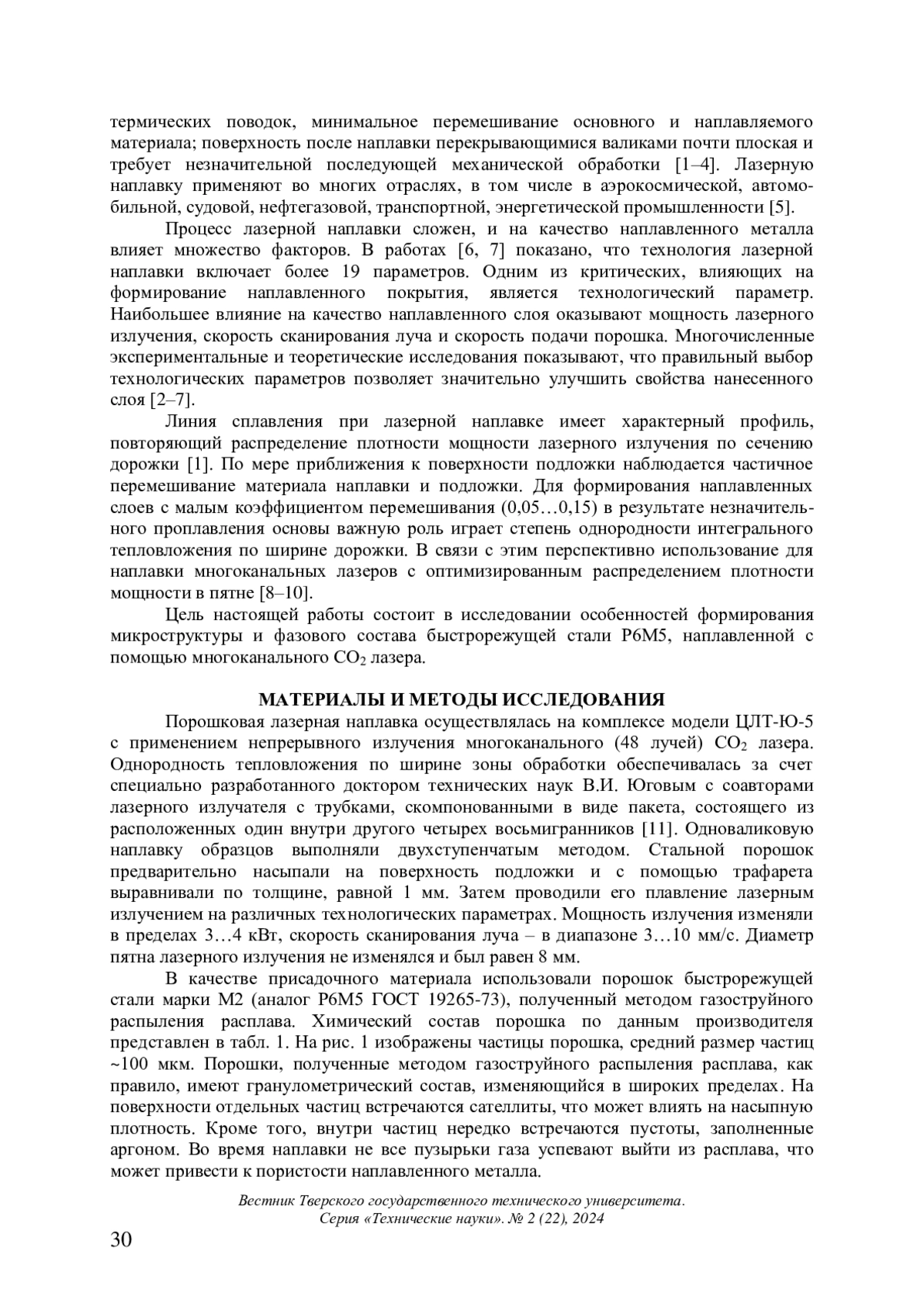 В промышленности применяются различные способы наплавки: электродуговая, лазерная, плазменная, газовая, токами высокой частоты и др. К преимуществам лазерной наплавки относятся небольшая зона термического влияния, отсутствие термических поводок, минимальное перемешивание основного и наплавляемого материала; поверхность после наплавки перекрывающимися валиками почти плоская и требует незначительной последующей механической обработки [1–4]. Лазерную наплавку применяют во многих отраслях, в том числе в аэрокосмической, автомобильной, судовой, нефтегазовой, транспортной, энергетической промышленности