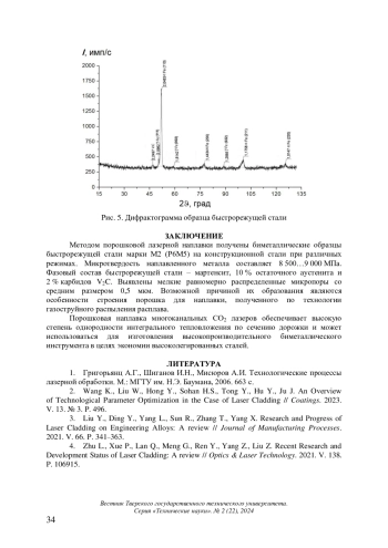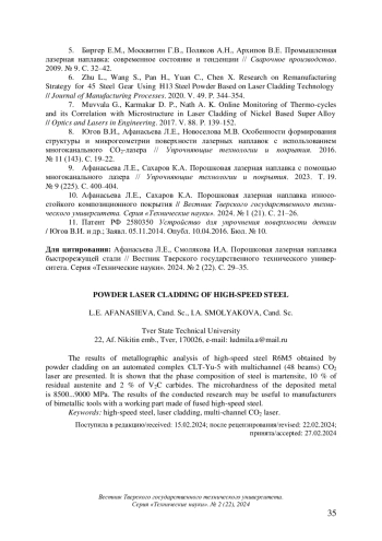 3. 	Liu Y., Ding Y., Yang L., Sun R., Zhang T., Yang X. Research and Progress of Laser Cladding on Engineering Alloys: A review // Journal of Manufacturing Processes.2021. V. 66. P. 341-363.  EDN: LTXJFC