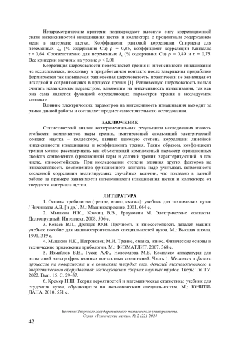 Рассмотрены корреляционные соотношения, описывающие зависимость линейной интенсивности изнашивания фрикционного контакта от коэффициента трения и твердости материалов компонентов пары трения. Соотношения получены статистической обработкой экспериментальных данных, относящихся к паре трения «щетка – коллектор». Установлена сильная корреляционная связь линейной интенсивности изнашивания компонентов пары трения с коэффициентом трения, а также обнаружена сильная положительная корреляция линейной интенсивности изнашивания с твердостью материалов щетки и коллектора, что противоречит известным результатам, свидетельствующим о возрастании износостойкости с увеличением твердости трущихся деталей. Приводится наиболее вероятное объяснение такого противоречия. Кроме того, указанная зависимость носит немонотонный характер с заметным возрастанием скорости изнашивания, если твердость материала щетки становится сравнимой с твердостью материала коллектора