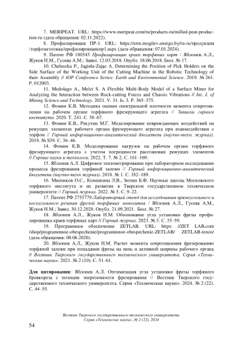 18. 	Яблонев А.Л., Жуков Н.М. Обоснование угла установки фрезы профилировщика краев торфяных карт // Горный журнал. 2023. № 3. С. 55-59.  EDN: ASDRLB