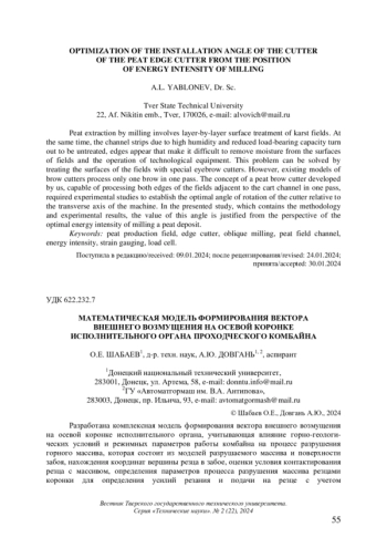 Добыча торфа фрезерным методом предполагает послойно-поверхностную сработку картовых полей. При этом приканальные полосы из-за повышенной влажности и пониженной несущей способности оказываются необработанными, появляются бровки, затрудняющие удаление влаги с поверхностей полей и работу технологического оборудования. Решить данную проблему можно путем обработки поверхностей полей специальными бровкорезами. Однако существующие модели бровкорезов обрабатывают за один проход только одну бровку. Разработанная нами концепция торфяного бровкореза, способного за один проход обрабатывать оба края полей, примыкающих к картовому каналу, потребовала проведения экспериментальных исследований для установления оптимального угла поворота фрезы по отношению к поперечной оси машины. В представляемом исследовании, содержащем методику проведения и результаты экспериментов, величина данного угла обосновывается с позиции оптимальной энергоемкости фрезерования торфяной залежи