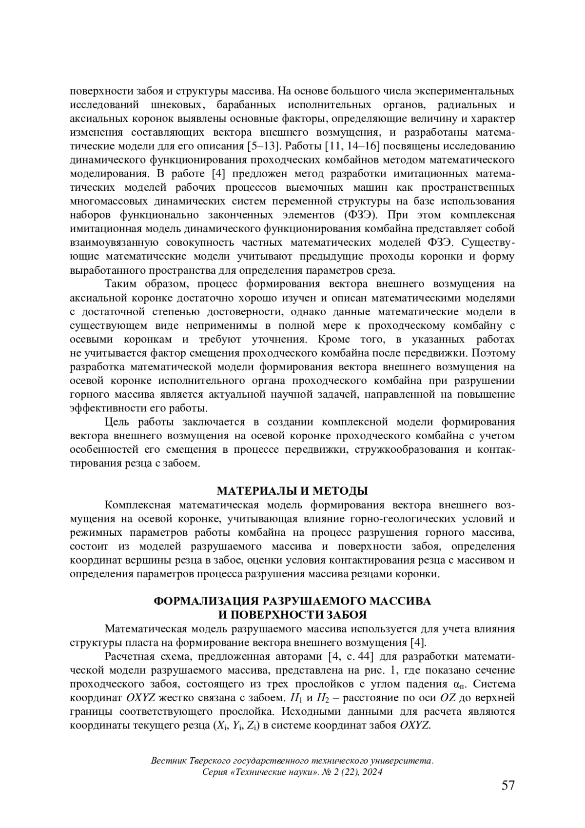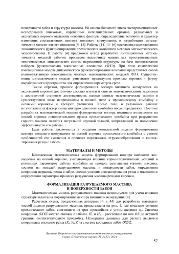 Разработана комплексная модель формирования вектора внешнего возмущения на осевой коронке исполнительного органа, учитывающая влияние горно-геологических условий и режимных параметров работы комбайна на процесс разрушения горного массива, которая состоит из моделей разрушаемого массива и поверхности забоя, нахождения координат вершины резца в забое, оценки условия контактирования резца с массивом, определения параметров процесса разрушения массива резцами коронки для определения усилий резания и подачи на резце с учетом выполнения условия контакта резца с забоем. Адекватность математической модели оценивалась путем сравнения показателей, полученных в ходе модельных и экспериментальных исследований: средней мощности на разрушение за цикл, теоретической производительности, удельных энергозатрат за цикл, длительности обработки забоя