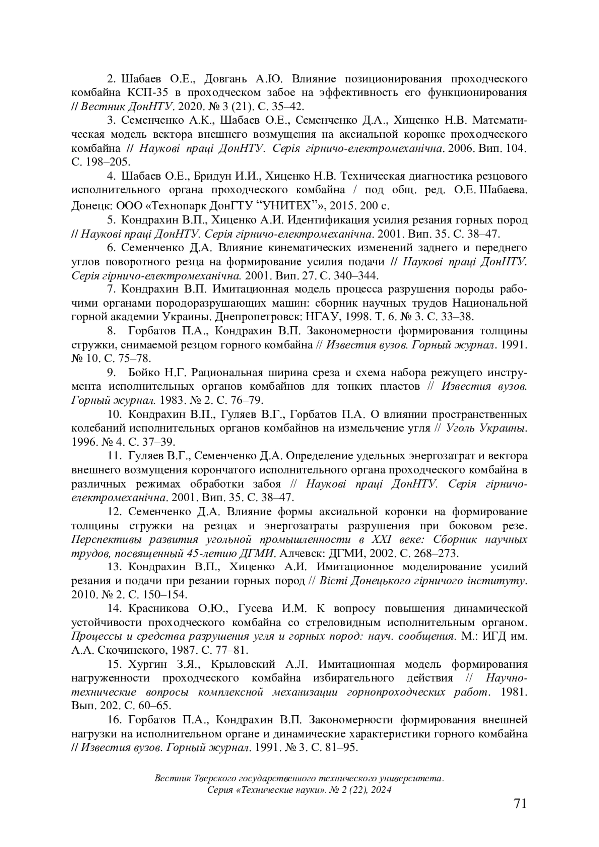 8. 	Горбатов П.А., Кондрахин В.П. Закономерности формирования толщины стружки, снимаемой резцом горного комбайна // Известия вузов. Горный журнал. 1991. № 10. С. 75-78.