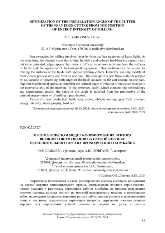 3. 	Семенченко А.К., Шабаев О.Е., Семенченко Д.А., Хиценко Н.В. Математическая модель вектора внешнего возмущения на аксиальной коронке проходческого комбайна // Науковi працi ДонНТУ. Серiя гiрничо-електромеханiчна. 2006. Вип. 104. С. 198-205.