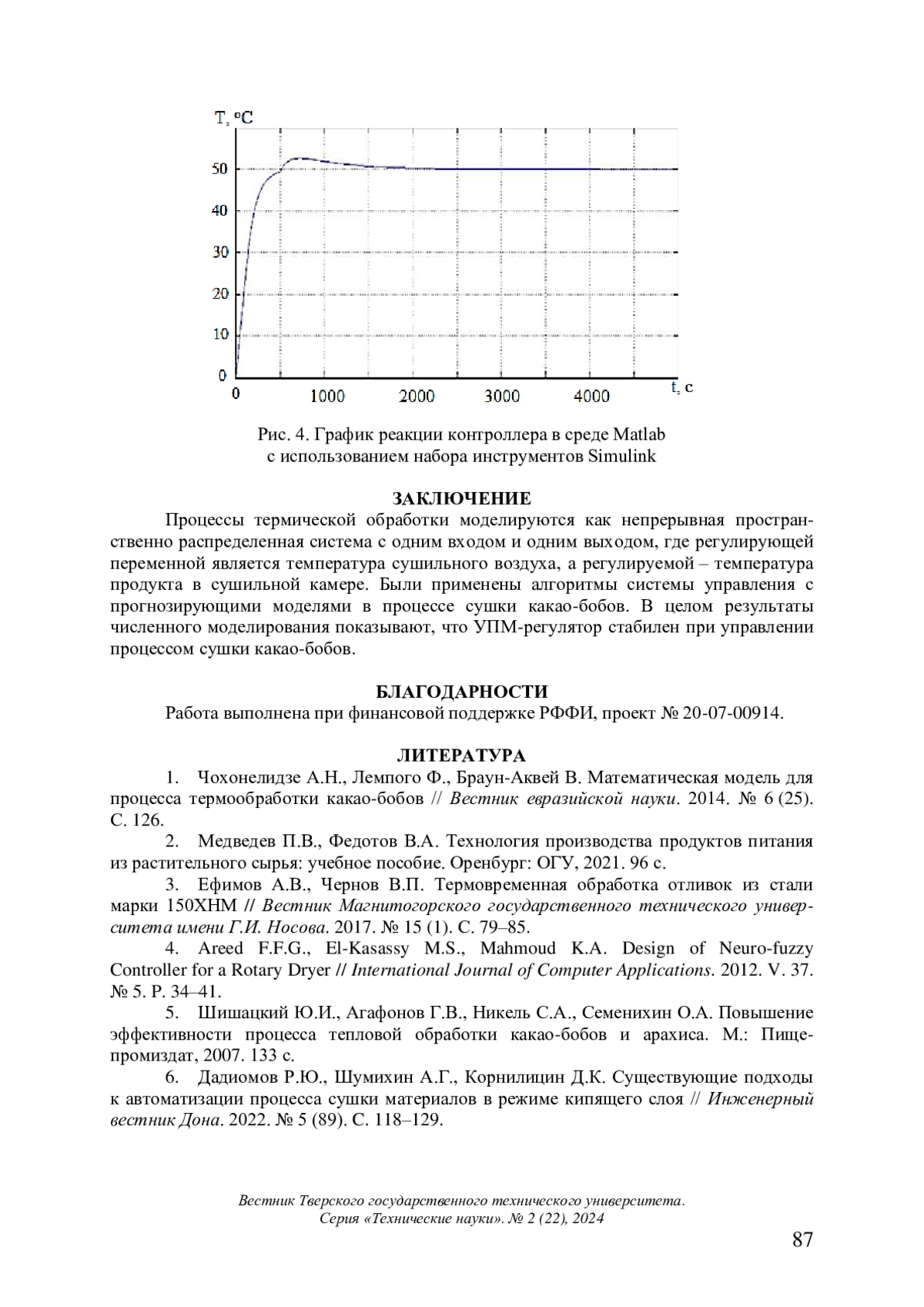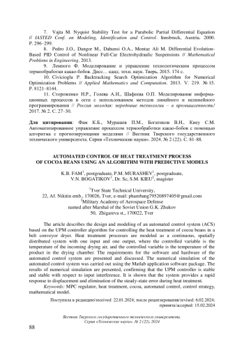 1. 	Чохонелидзе А.Н., Лемпого Ф., Браун-Аквей В. Математическая модель для процесса термообработки какао-бобов // Вестник евразийской науки. 2014. № 6 (25). С. 126.