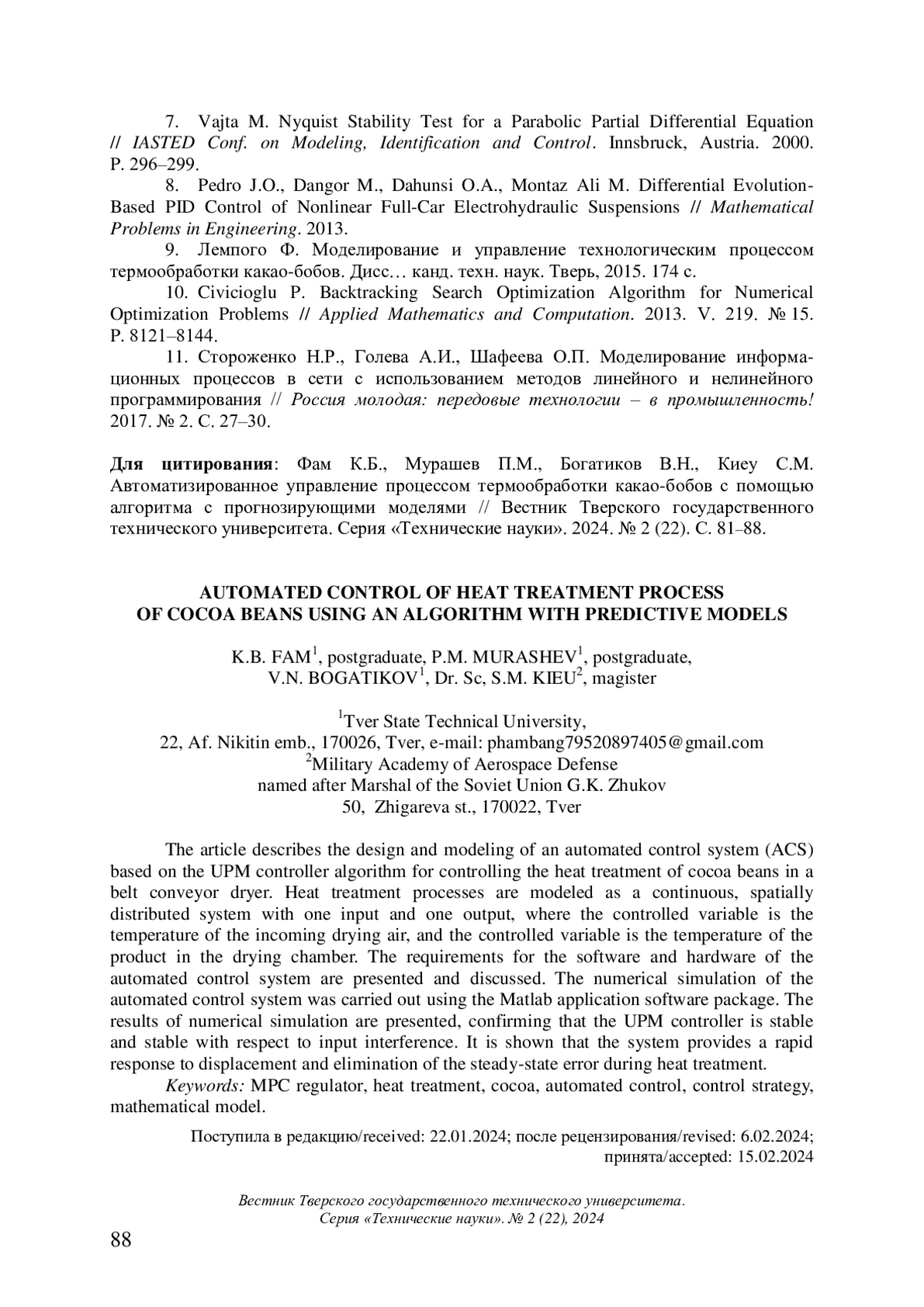 9. 	Лемпого Ф. Моделирование и управление технологическим процессом термообработки какао-бобов. Дисс… канд. техн. наук. Тверь, 2015. 174 с.