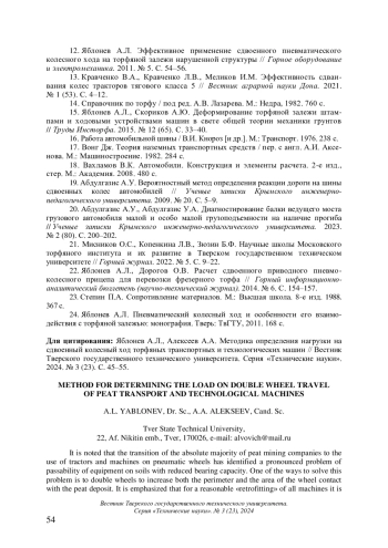 12. 	Яблонев А.Л. Эффективное применение сдвоенного пневматического колесного хода на торфяной залежи нарушенной структуры // Горное оборудование и электромеханика. 2011. № 5. С. 54-56.  EDN: NTYZNP