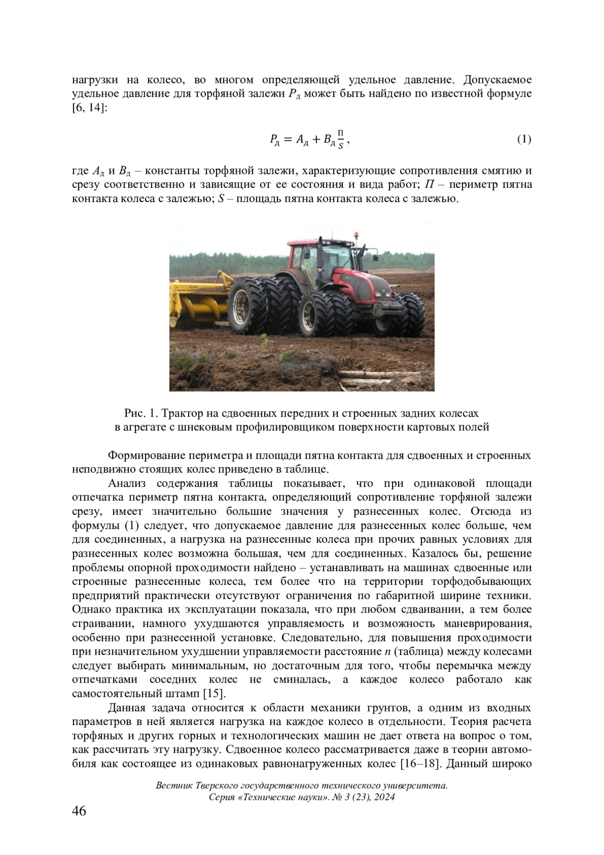 Отмечено, что переход абсолютного большинства торфодобывающих компаний на использование тракторов и машин на пневмоколесном ходу обозначил ярко выраженную проблему проходимости техники по грунтам с пониженной несущей способностью. Одним из путей решения данной проблемы является сдваивание колес для увеличения как периметра, так и площади пятна контакта колеса с торфяной залежью. Подчеркнуто, что для обоснованного «доукомплектования» всех машин необходимо правильно рассчитать нагрузки на сдвоенный колесный ход. В настоящий момент такая методика носит весьма приблизительный и условный характер, подразумевая равенство нагрузок на оба колеса в блоке. Вместе с тем опыт эксплуатации пневмоколесной техники, особенно на дорогах с твердым покрытием, показывает, что внутренние колеса изнашиваются значительно быстрее наружных, и это свидетельствует о большей нагруженности внутренних колес. Представлена методика по ориентировочному расчету нагрузок на оба колеса в блоке, подтверждающая данный вывод