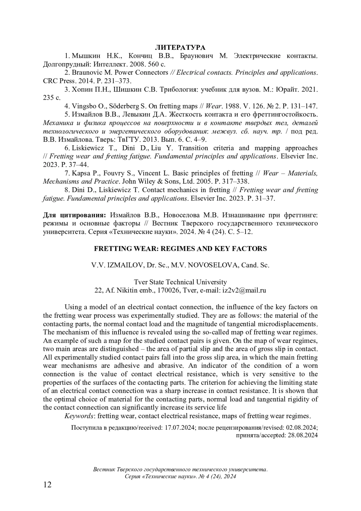 5. 	Измайлов В.В., Левыкин Д.А. Жесткость контакта и его фреттингостойкость. Механика и физика процессов на поверхности и в контакте твердых тел, деталей технологического и энергетического оборудования: межвуз. сб. науч. тр. / под ред. В.В. Измайлова. Тверь: ТвГТУ. 2013. Вып. 6. С. 4-9.  EDN: PMLIXP