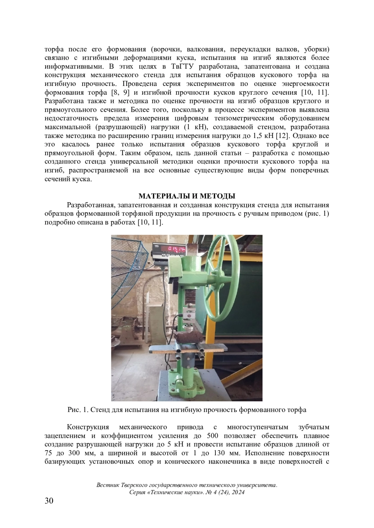 В статье указано, что Тверским государственным техническим университетом разработана, запатентована и создана конструкция механического стенда, оснащенного системой цифрового тензометрирования и способного развивать и фиксировать разрушающую нагрузку для испытания на прочность образцов формованной торфяной продукции. Отмечено, что его планомерное использование с целью корректировки и рационализации режимов работы машин для добычи и производства кускового торфа позволит оперативно достигать стабильного качества торфа, однако методика применения данного стенда была сформирована ранее лишь для образцов кусков круглого и прямоугольного сечения. Приведены сведения, разработанные материалы и методика, позволяющие использовать созданный стенд для всех основных форм поперечных сечений кускового торфа, получаемых как в полевых, так и в заводских (стационарных) условиях