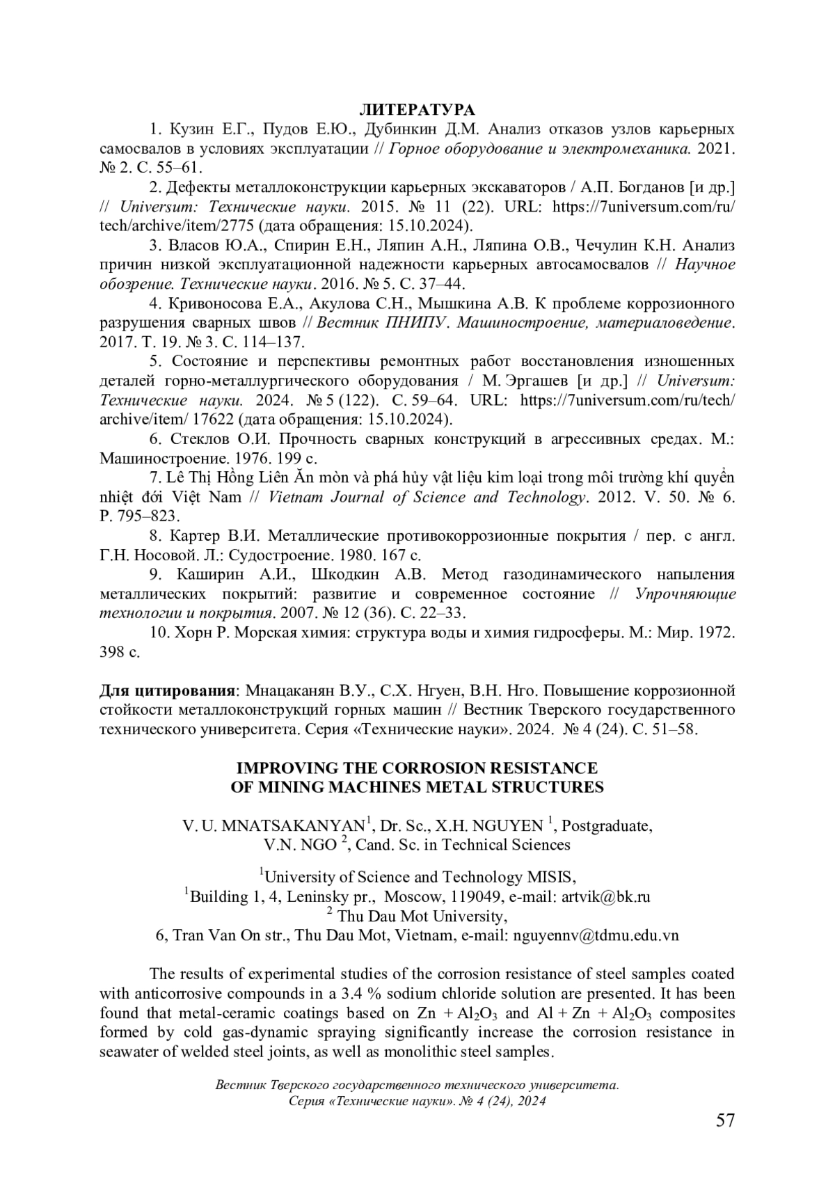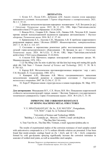 Потери от коррозии и износа в горнодобывающей промышленности Вьетнама, где добыча твердых полезных ископаемых ведется как на суше, так и в прибрежных районах Южно-Китайского моря, имеют колоссальные масштабы. Жесткие условия эксплуатации горных машин, характеризуемые наличием абразивных сред, а также динамических и циклических нагрузок, в тропическом климате страны существенно усугубляются высокой влажностью воздуха и воздействием агрессивной морской среды, что приводит к интенсивной коррозии металлоконструкций и их ускоренному разрушению. Особенно чувствительны к морской атмосфере сварные соединения, широко применяемые при сборке, монтаже и ремонте горных машин, в частности карьерных экскаваторов, составляющих основную часть выемочной техники. Для ремонта несущих и базовых элементов металлоконструкций горных машин применяют технологии сварки и наплавки