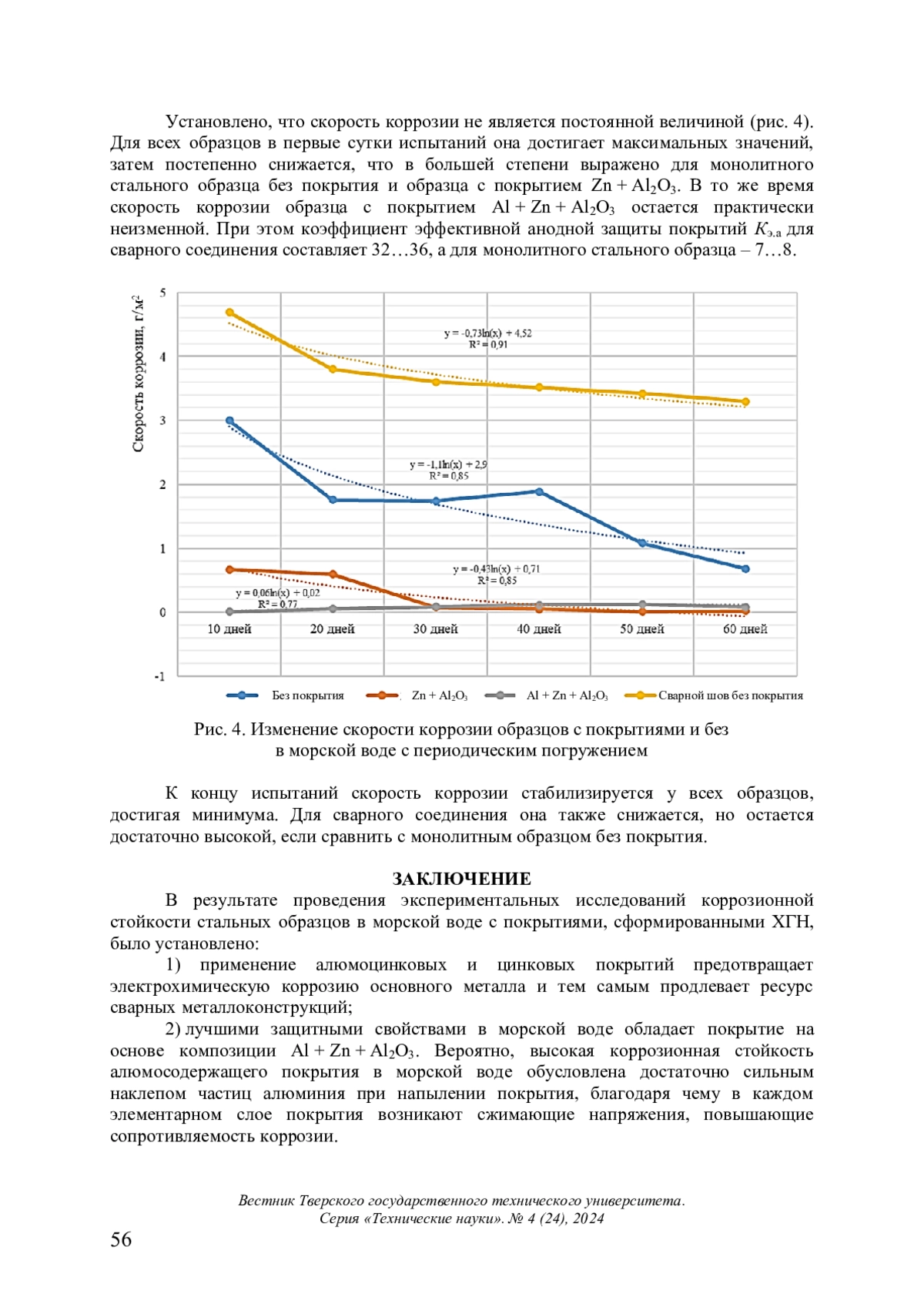 Представлены результаты экспериментальных исследований коррозионной стойкости стальных образцов, покрытых антикоррозионными составами, в 3,4%-м растворе хлорида натрия. Установлено, что металлокерамические покрытия на основе композитов Zn + Al2O3 и Аl + Zn + Al2O3, сформированные холодным газодинамическим напылением, существенно повышают сопротивляемость коррозии в морской воде у сварных соединений из стали, а также монолитных стальных образцов
