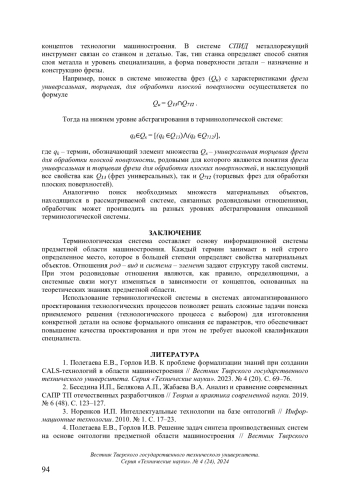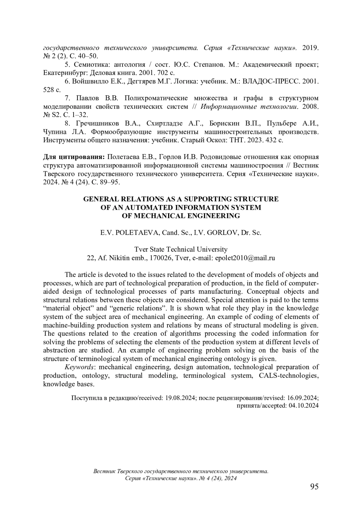 1. 	Полетаева Е.В., Горлов И.В. К проблеме формализации знаний при создании CALS-технологий в области машиностроения // Вестник Тверского государственного технического университета. Серия “Технические науки”. 2023. № 4 (20). С. 69-76.  EDN: YZYSJU