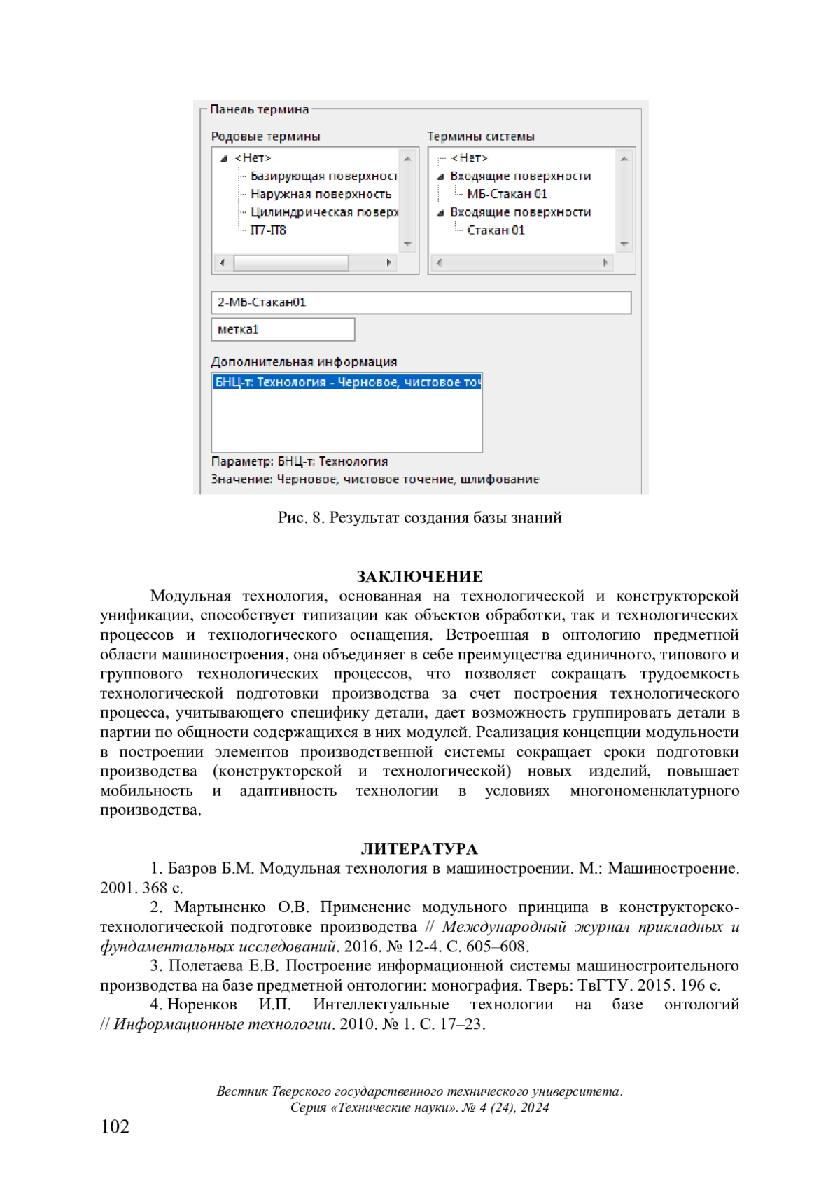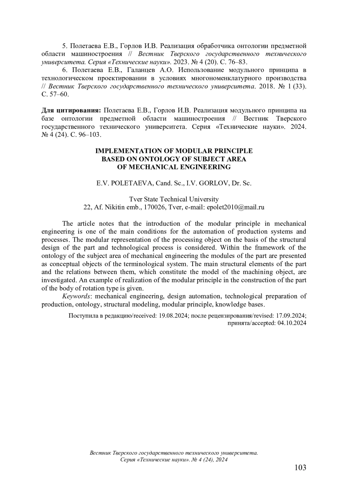 5. Полетаева Е.В., Горлов И.В. Реализация обработчика онтологии предметной области машиностроения // Вестник Тверского государственного технического университета. Серия “Технические науки”. 2023. № 4 (20). С. 76-83. EDN: JSCHFZ