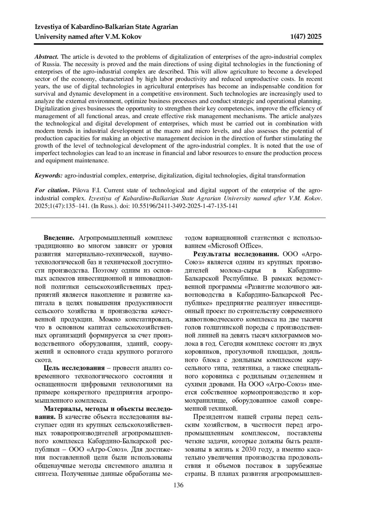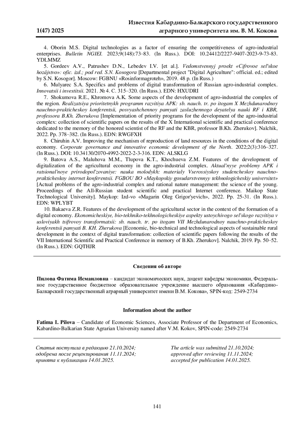 2. 	Дорогов И. Ф., Пилова Ф. И. Цифровизация сельского хозяйства и внедрение цифровых технологий в АПК // Известия Кабардино-Балкарского государственного аграрного университета им. В. М. Кокова. 2021. № 1(31). С. 118-122. EDN: GPGGYJ