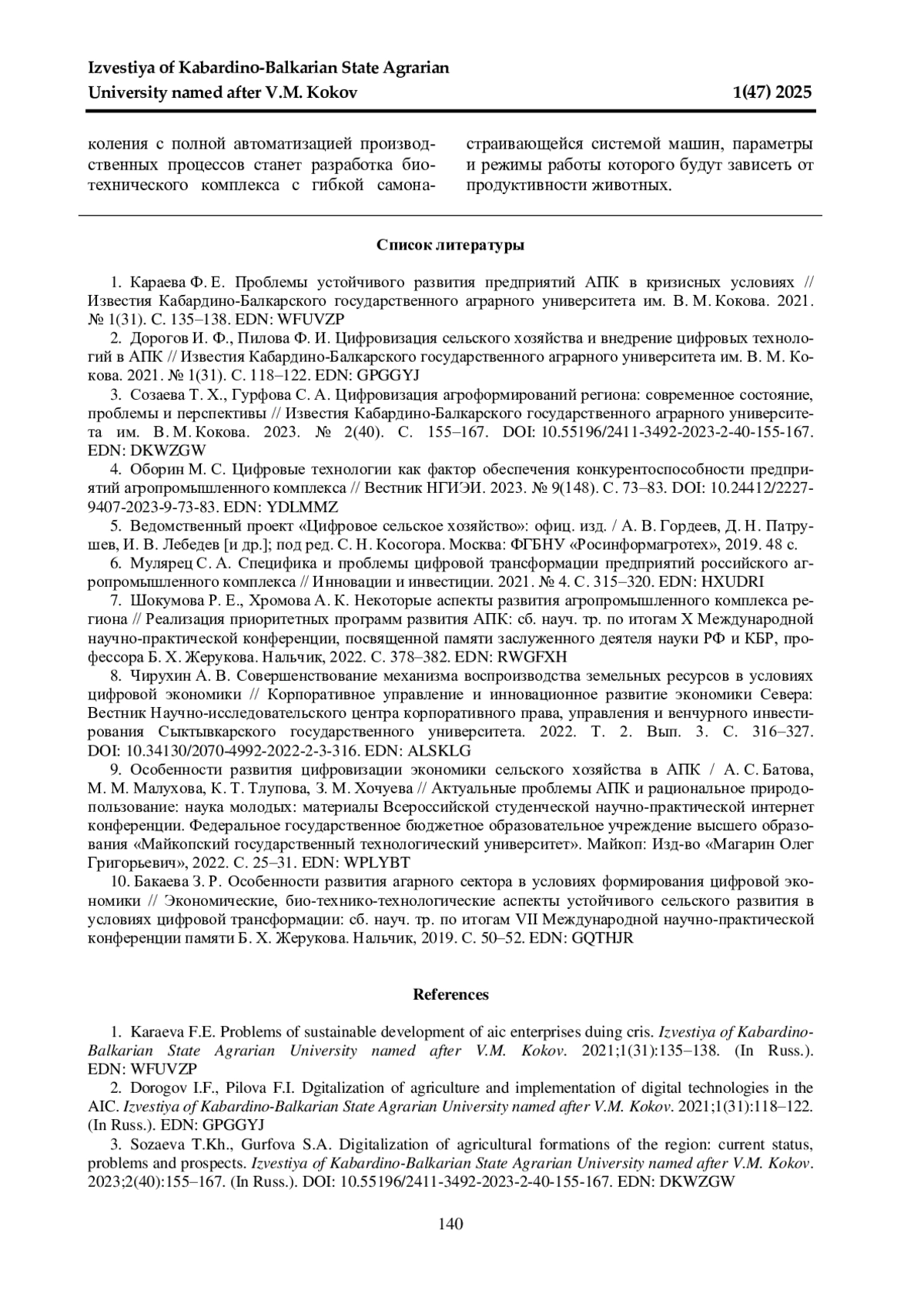 3. 	Созаева Т. Х., Гурфова С. А. Цифровизация агроформирований региона: современное состояние, проблемы и перспективы // Известия Кабардино-Балкарского государственного аграрного университета им. В. М. Кокова. 2023. № 2(40). C. 155-167. DOI: 10.55196/2411-3492-2023-2-40-155-167 EDN: DKWZGW