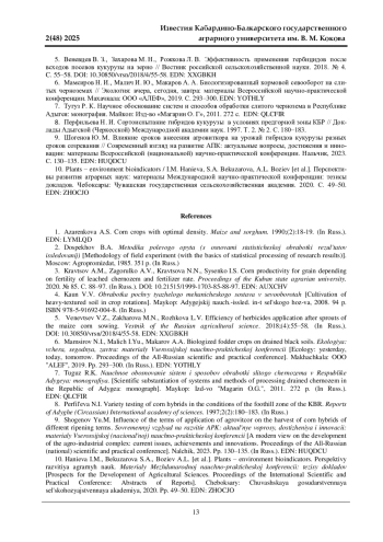 5. 	Веневцев В. З., Захарова М. Н., Рожкова Л. В. Эффективность применения гербицидов после всходов посевов кукурузы на зерно // Вестник российской сельскохозяйственной науки. 2018. № 4. C. 55-58. DOI: 10.30850/vrsn/2018/4/55-58 EDN: XXGBKH
