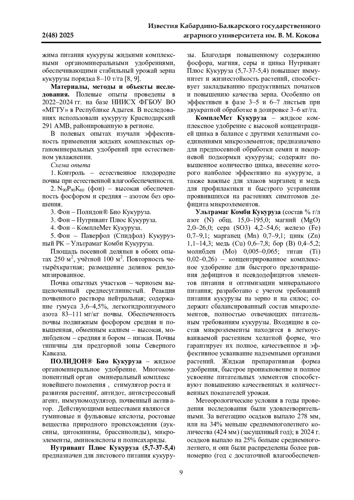 Исследование посвящено повышению урожайности кукурузы в условиях Республики Адыгея, где нестабильность урожая (около 4 т/га) связана с дефицитом подвижных форм азота и фосфора в почве. Цель работы - оценка эффективности жидких комплексных органоминеральных удобрений для увеличения продуктивности и качества зерна. Полевые опыты проводились в 2022-2024 гг. на чернозѐмах выщелоченных среднесуглинистых с использованием районированного сорта кукурузы. Изучалось влияние пяти видов удобрений (Полидон® Био, Нутривант Плюс, КомплеМет, Паверфол, Ультрамаг Комби) при различных режимах влажности. Результаты показали, что применение жидких комплексных органоминеральных удобрений в сочетании с оптимальным увлажнением значительно повышает биометрические показатели: площадь листьев увеличивалась на 7-10%, высота растений - до 322 см, а урожайность зерна достигала 8,98 т/га (2023 г.). Наибольшая эффективность отмечена при внесении 120 кг/га азота и фосфора, что обеспечило прирост сухой массы на 15-24%. В засушливые годы (2022 г.) внесение удобрений без орошения не давало существенного эффекта, что подтверждает важность комплексного подхода. Научная новизна работы заключается в изучении действия жидких комплексных органоминеральных удобрений в условиях выщелоченных чернозѐмов. Практическая ценность - разработка агротехнических рекомендаций, позволяющих стабилизировать урожайность на уровне 8-10 т/га. Исследование демонстрирует, что оптимизация минерального питания и влагообеспеченности является ключевым фактором повышения продуктивности кукурузы в регионе.