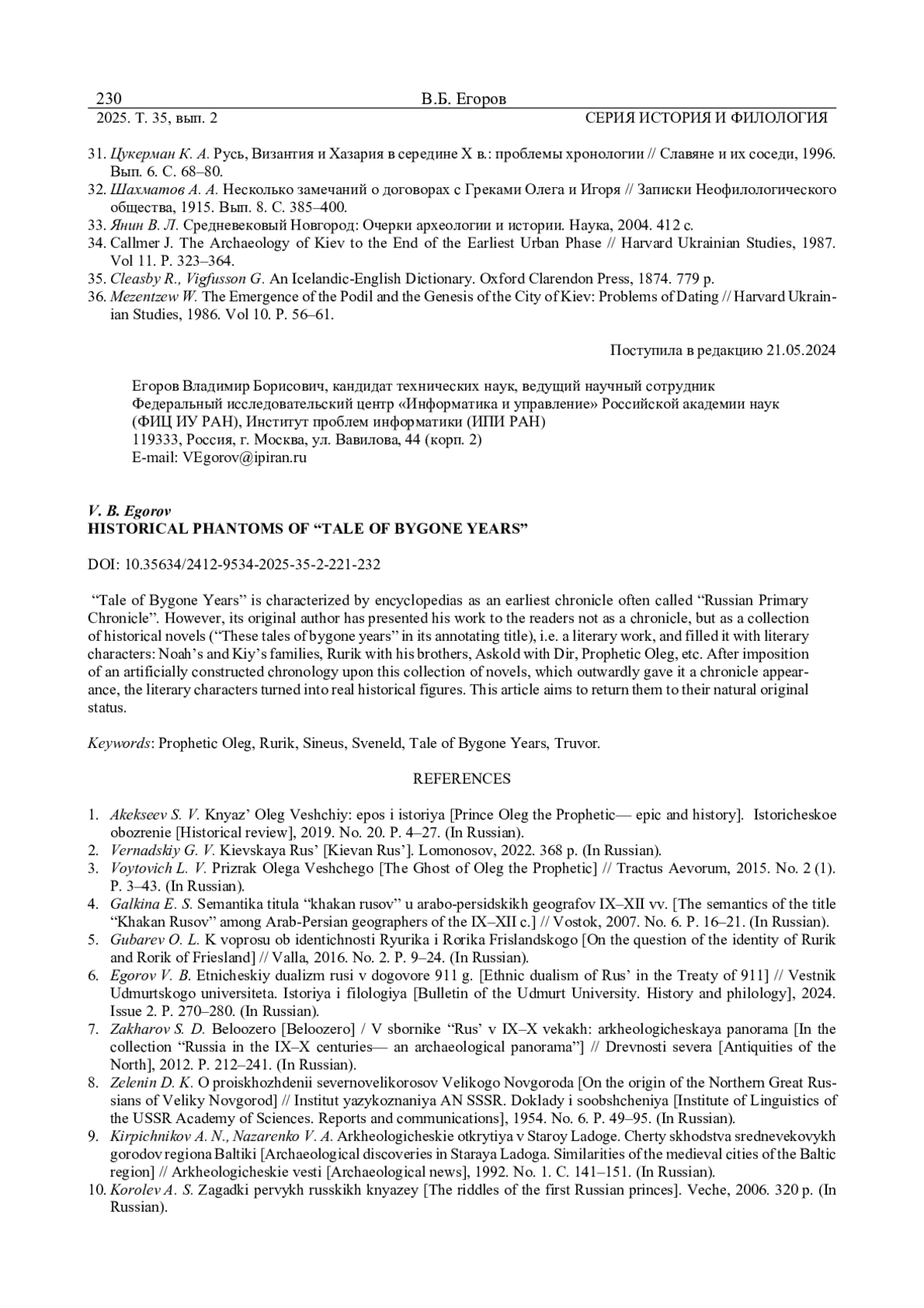 6. 	Егоров В. Б. Этнический дуализм руси в договоре 911 г. // Вестник Удмуртского университета. История и филология, 2024. Вып. 2. С. 270-280.