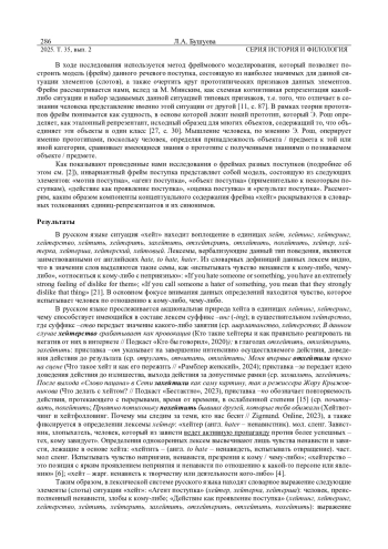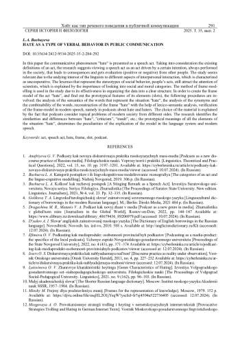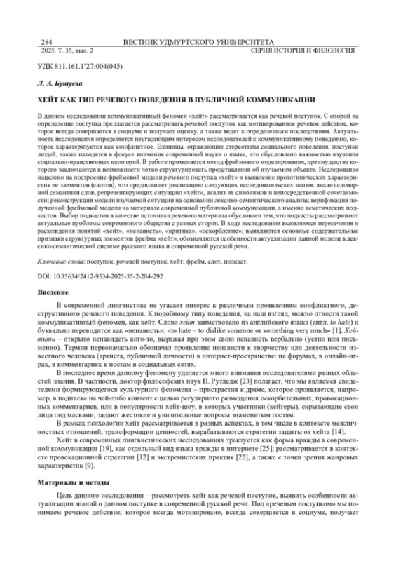 В данном исследовании коммуникативный феномен «хейт» рассматривается как речевой поступок. С опорой на определение поступка предлагается рассматривать речевой поступок как мотивированное речевое действие, которое всегда совершается в социуме и получает оценку, а также ведет к определенным последствиям. Актуальность исследования определяется неугасающим интересом исследователей к коммуникативному поведению, которое характеризуется как конфликтное. Единицы, отражающие стереотипы социального поведения, поступки людей, также находятся в фокусе внимания современной науки о языке, что обусловлено важностью изучения социально-нравственных категорий. В работе применяется метод фреймового моделирования, преимущества которого заключаются в возможности четко структурировать представления об изучаемом объекте. Исследование нацелено на построение фреймовой модели речевого поступка «хейт» и выявление прототипических характеристик ее элементов (слотов), что предполагает реализацию следующих исследовательских шагов: анализ словарной семантики слов, репрезентирующих ситуацию «хейт», анализ их синонимов и непосредственной сочетаемости; реконструкция модели изучаемой ситуации на основании лексико-семантического анализа; верификация полученной фреймовой модели на материале современной публичной коммуникации, а именно тематических подкастов. Выбор подкастов в качестве источника речевого материала обусловлен тем, что подкасты рассматривают актуальные проблемы современного общества с разных сторон. В ходе исследования выявляются пересечения и расхождения понятий «хейт», «ненависть», «критика», «оскорбление»; выявляются основные содержательные признаки структурных элементов фрейма «хейт», обозначаются особенности актуализации данной модели в лексико-семантической системе русского языка и современной русской речи.