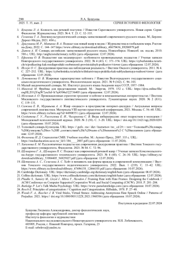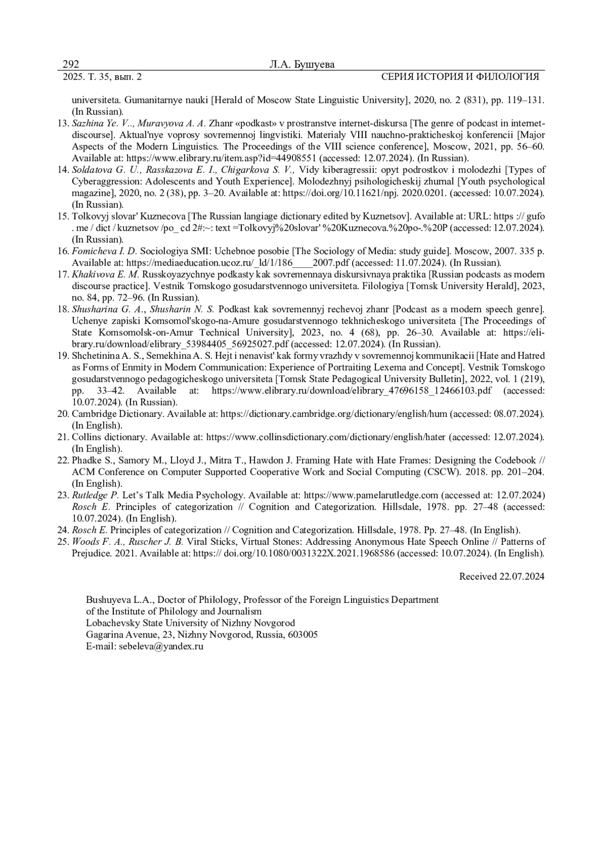19. 	Щетинина А. С., Семехина А. С. Хейт и ненависть как формы вражды в современной коммуникации // Вестник Томского государственного педагогического университета. 2022. Вып. 1 (219). С. 33-42. URL: https://www.elibrary.ru/download/elibrary_47696158_12466103.pdf (дата обращения: 10.07.2024).