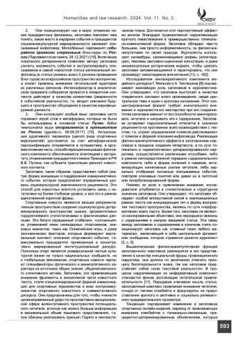 Введение. В современном мире конситуативно детерминированное описание спортивных событий становится мощным инструментом формирования национальной идеологии и культуры. Исследование заголовочных комплексов в спортивных изданиях позволяет глубже понять механизмы манифестации фатической и манипулятивной функций, которые являются на сегодняшний момент доминантными для языка СМИ. Материалы и методы. В статье на основе контаминированной классификации дискурсивной значимости спортивных инфоповодов и дискурсивно-модусного анализа с учетом фокуса адресата анализируются различные типы заголовков как базовых кодов интерпретации основного текста сообщений, их главные функции и функциональная прагматика влияния на гипотетического реципиента. Анализ. Особое внимание уделяется сравнению спецификаторов фатической и информационной направленности как наиболее репрезентативных механизмов двунаправленных векторов, действующих в рамках повышения релевантности описываемого события и ассоциированных с ним социокультурных и идеологических феноменов. Автор утверждает, что использование приемов манипулятивного и фатико-экспликаторного характера в заголовках реализует максимальный перлокутивный эффект при условии соблюдения равновесного соотношения эпизодической сенсационности и оперативной информативности. Учет в компрессированном пространстве заголовочного комплекса аксиологических доминант признается базовым условием привлечения внимания широкого круга читателей; а использование единиц, маркирующих эксклюзивность и эпизодическую детерминированность описываемого инфоповода, наиболее эффективными приемами реализации максимального манипулятивного эффекта. Результаты. Заголовочный комплекс представляет собой максимально сжатую регулятивно-фатическую модель целостного текста описания, включающего установки для интерпретации всего описания и задающего аксиологические векторы оценивания инфоповода. При этом сильная позиция текста, которую представляет заголовок активизирует внимание читательской аудитории посредством провокационной нарративизации, затрагивающей ассоциации с иными социально значимыми областями.