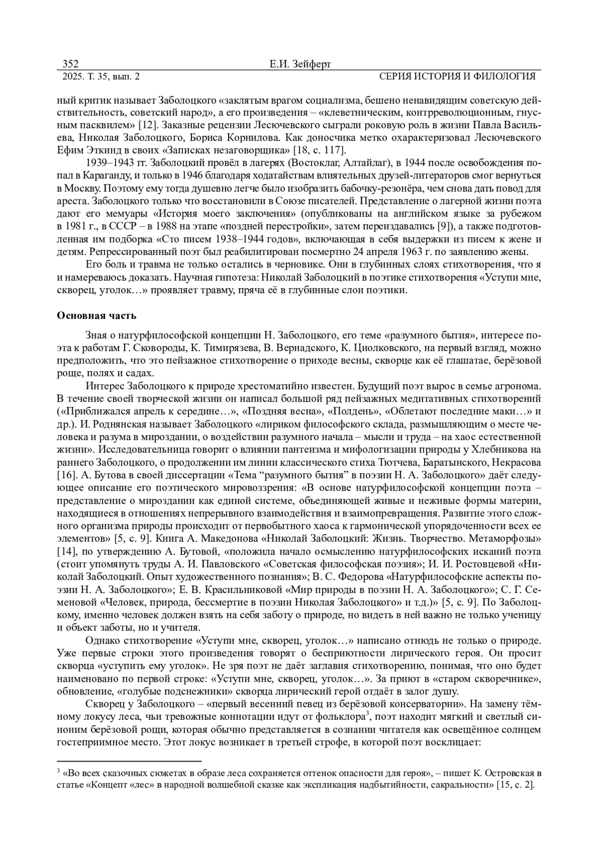 Стихотворение Н. Заболоцкого «Уступи мне, скворец, уголок…» (1946), на первый взгляд, видится пейзажным. Написанное автором с натурфилософской концепцией, оно зачастую и интерпретируется в школьной практике и мелодекламациях как произведение о весеннем пробуждении природы и пении скворца. Но эти темы лежат лишь на поверхности стихотворения. Поэт, прошедший перипетии сталинских лагерей и чудом возвратившийся в 1946 г. в Москву, в этом произведении выражает травму на уровнях фразеологии и художественных тропов, субъектно-объектной организации, пространства и времени (хронотоп, локус), композиции и лирического сюжета. Напуганный арестом, годами лагерей и ссылкой в Караганду, поэт не осмеливается прямо выражать свои переживания. Он заменяет первоначально записанную смелую шестую строфу на более осторожную, жертвуя эстетическим её качеством. Для описания несвободы в советской стране Заболоцкий в изображении весенней природы прибегает к карнавализации (М. Бахтин), с одной стороны, живописуя торжество победы советского народа в Великой Отечественной войне и своего временного освобождения от тягот существующего строя, а с другой, парадоксально демонстрируя давление и насилие сталинского режима.