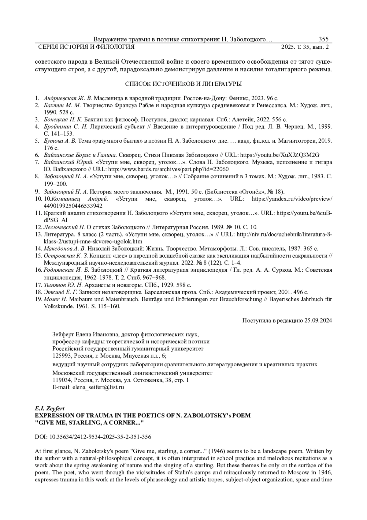 5. 	Бутова А. В. Тема “разумного бытия” в поэзии Н. А. Заболоцкого: дис. … канд. филол. н. Магнитогорск, 2019. 176 с. EDN: UAEEAS