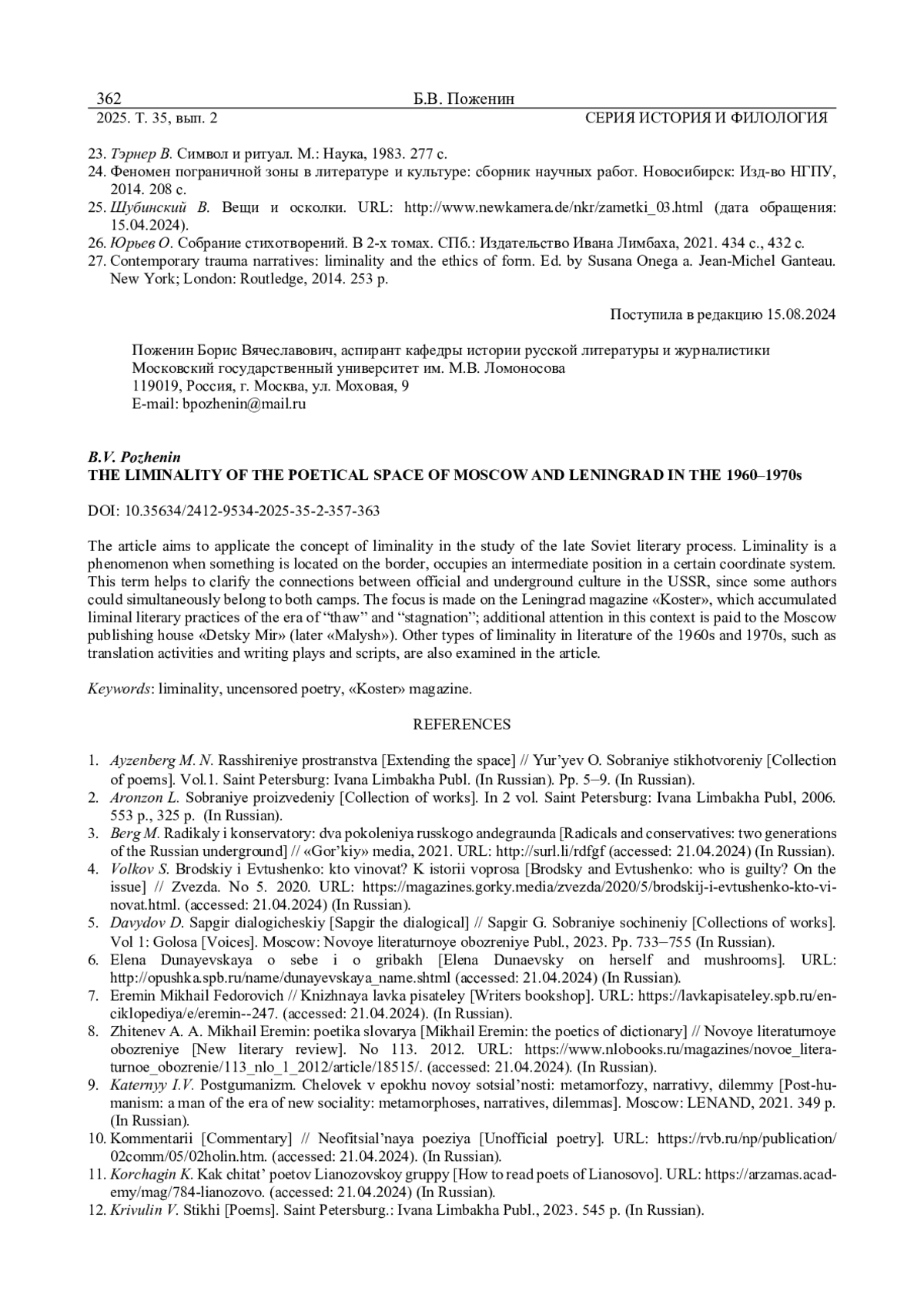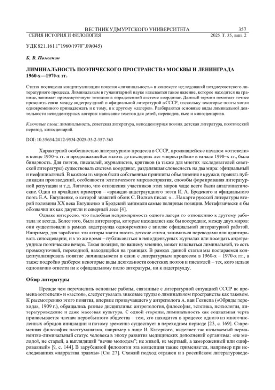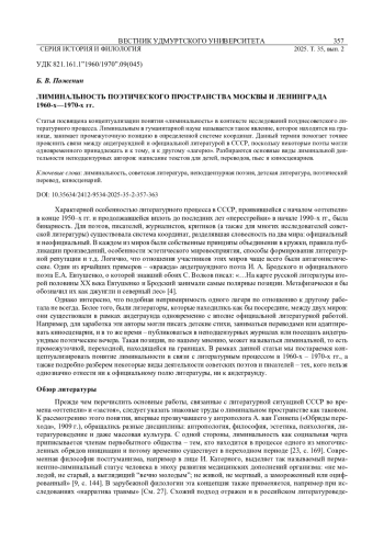 Статья посвящена концептуализации понятия «лиминальность» в контексте исследований позднесоветского литературного процесса. Лиминальным в гуманитарной науке называется такое явление, которое находится на границе, занимает промежуточную позицию в определенной системе координат. Данный термин помогает точнее прояснить связи между андеграундной и официальной литературой в СССР, поскольку некоторые поэты могли одновременного принадлежать и к тому, и к другому «лагерю». Разбираются основные виды лиминальной деятельности неподцензурных авторов: написание текстов для детей, переводов, пьес и киносценариев.