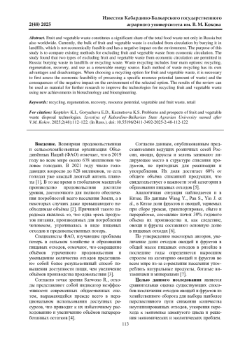 Отходы овощей и фруктов составляют значительную долю от общей массы пищевых отходов не только в России, но и во всем мире. В настоящее время основная масса отходов овощей и фруктов исключается из оборота путем их захоронения на полигонах, что экономически не выгодно и негативно влияет на окружающую среду. Целью данного исследования является сравнительная оценка существующих способов исключения отходов овощей и фруктов из хозяйственного оборота. В результате исследования было установлено, что в России разрешены два вида исключения отходов овощей и фруктов из хозяйственного оборота: захоронение отходов на полигонах или утилизация отходов. Утилизация отходов включает четыре основных варианта: рециклинг, регенерация, рекуперация и использование в качестве возобновляемого источника энергии. Каждый способ утилизации отходов имеет свои достоинства и недостатки. При выборе варианта утилизации отходов овощей и фруктов необходимо предварительно проводить оценку экономической целесообразности переработки конкретного ресурсного потенциала (количества отходов) и последствий негативного влияния на окружающую среду выбранного варианта. Результаты обзора могут быть использованы в качестве материала для дальнейших исследований по совершенствованию технологий переработки отходов овощей и фруктов с использованием новых достижений биотехнологии и биоинженерии.