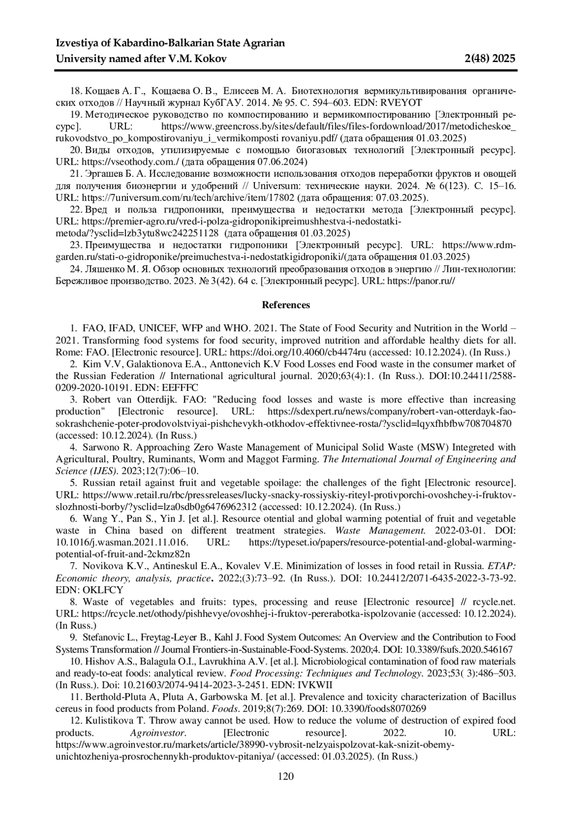 2. 	Ким В. В., Галактионова Е. А., Антоневич К. В. Продовольственные потери и пищевые отходы на потребительском рынке РФ // International agricultural journal. 2020. Т. 63 № 4. С. 1. DOI: 10.24411/2588-0209-2020-10191 EDN: EEFFFC