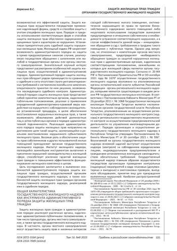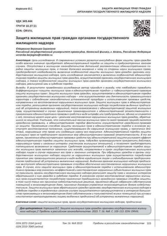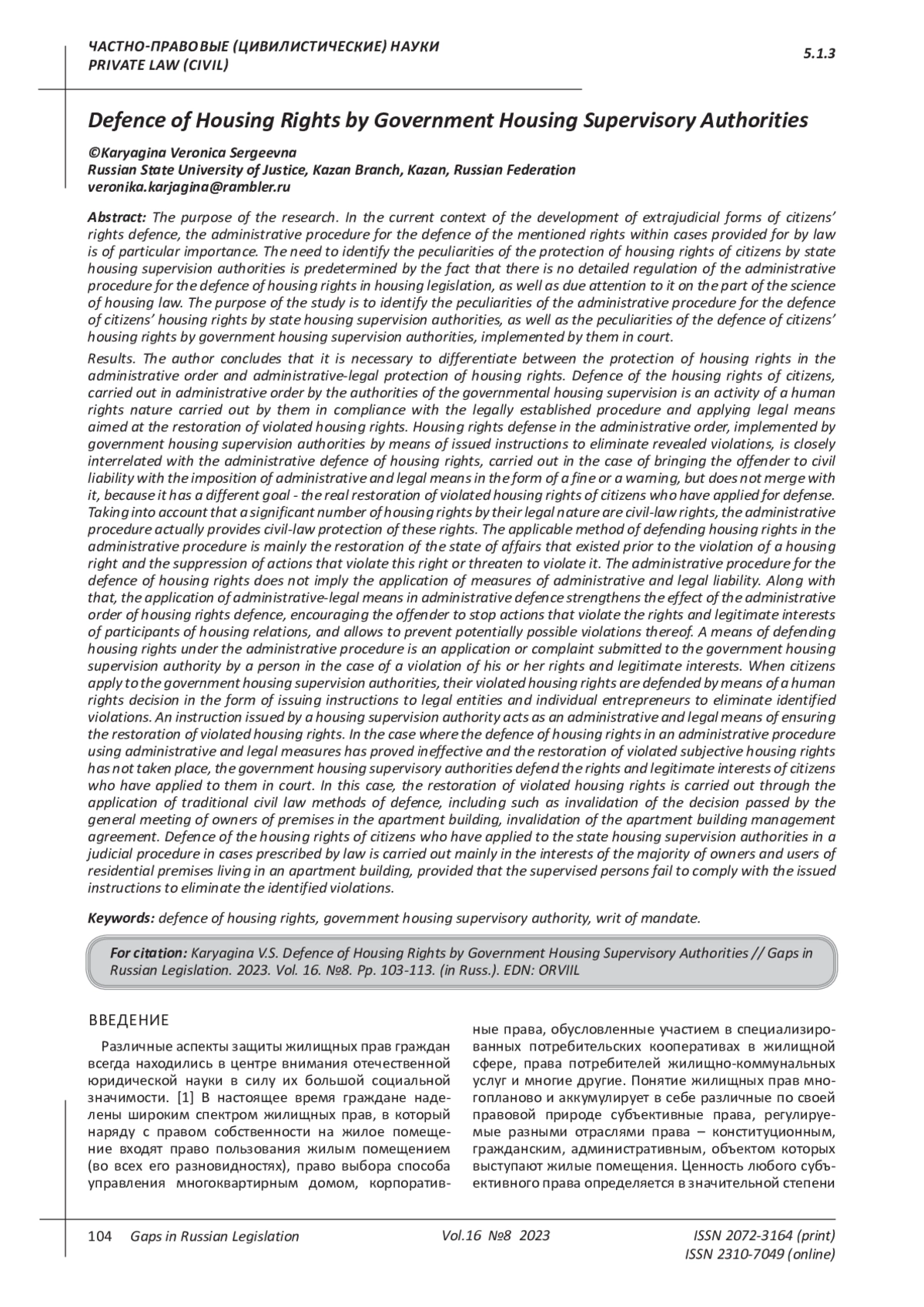 В современных условиях развития внесудебных форм защиты прав граждан особо важное значение приобретает административный порядок их защиты в предусмотренных законом случаях. Отсутствие в жилищном законодательстве детальной регламентации административного порядка защиты жилищных прав, а также должного внимания к нему со стороны науки жилищного права, предопределяет необходимость выявления особенностей защиты жилищных прав граждан органами государственного жилищного надзора. Цель исследования заключается в выявлении особенностей административного порядка защиты жилищных прав граждан, осуществляемой органами государственного жилищного надзора, а также особенностей защиты жилищных прав граждан органами государственного жилищного надзора, реализуемой ими в судебном порядке.